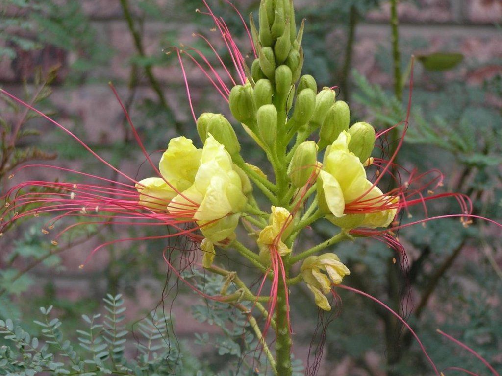 Caesalpinia gilliesii - auffällige Zierpflanze aus Südamerika. Er bildet einen locker verzweigten, 1-3 m hohen Strauch mit wunderschönen, neuartigen Blütenständen. Seine Blätter sind doppelt gefiedert mit 6-12 Paaren länglicher, feiner, meist laubabwerfender Fiederblättchen. Die Blüten sind groß, fünfzählig und symmetrisch. Sie wachsen in Trauben von gelber Farbe, aus denen nach und nach rote Staubfäden hervortreten. Er schmückt von Juli bis August, danach entwickelt sich die Frucht, die eine 6-10 cm lange, abgeflachte, behaarte, hängende Hülse ist, die in reifem Zustand braun ist. In seiner Heimat lockt er Kolibris an, bei uns vor allem Schmetterlinge. Sie können auch im Topf kultiviert werden.
