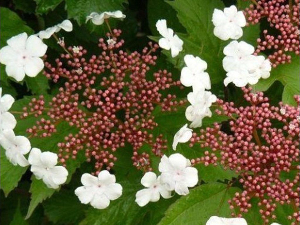 Viburnum sargentii 'Onondaga' - ein Strauch, der als junge Pflanze aufrecht, später eher rundlich wächst. Die Blätter sind fein strukturiert, samtig. Junge Blätter haben eine kastanienbraune Farbe, später werden sie grün, behalten aber einen leichten Kastanienton bei. Im Mai öffnen sich braune, lockige Knospen mit cremeweißen Blüten mit einem Hauch von Rosa, sie haben violette Staubbeutel. Die kugelförmigen Blütenstände sind sehr luftig.