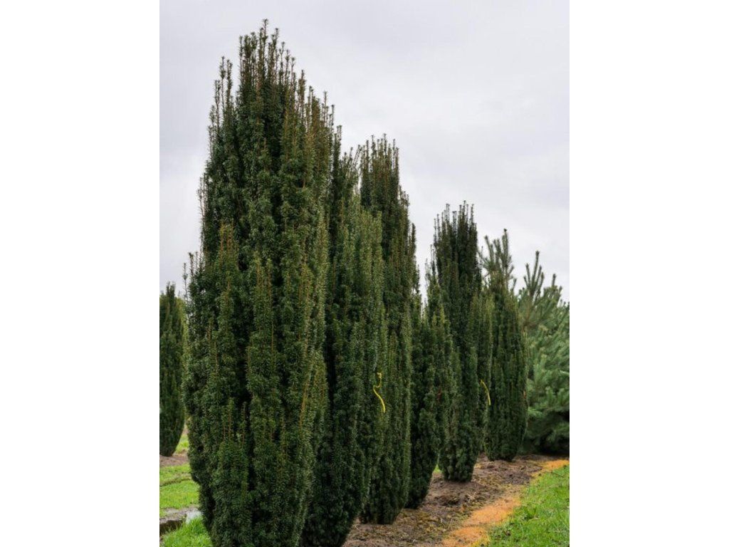 Eibe 'Fastigiata' - breit bis eng säulenförmiger Baum, der eine Höhe von etwa 4-7 m erreicht, aber ältere Exemplare können gelegentlich fast so breit wie hoch sein. Es handelt sich um Pflanzen, die in Kultur normalerweise eine Höhe von etwa 2-3 m erreichen, oft mit einer schmalen säulenförmigen oder spindelförmigen Gestalt. Die Äste sind zahlreich, gerade, kurz und gut verzweigt, was ein kompaktes und dichtes Aussehen erzeugt. Die Nadeln sind gleichmäßig auf allen Seiten verteilt, etwa 20-30 mm lang, biegen sich nach unten leicht und haben eine dunkel schwarzgrüne Farbe. Dies ist ein eleganter und attraktiver Kultivar der Eibe, der in Gärten aufgrund seiner ausgeprägten und kompakten Form häufig verwendet wird.