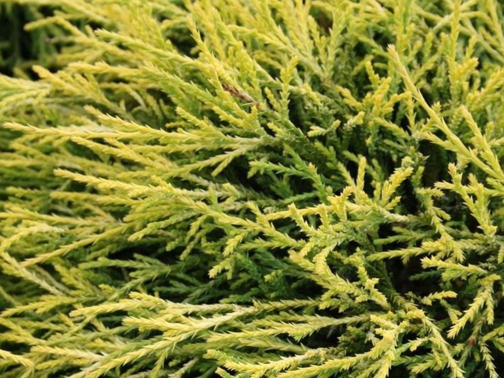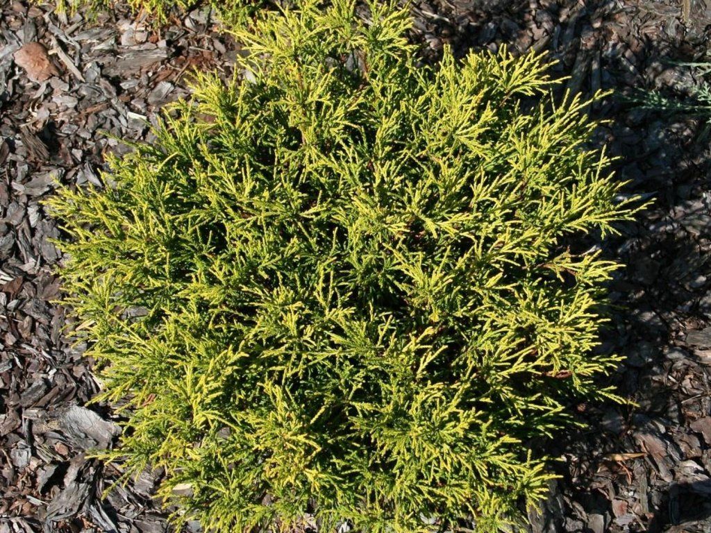 Sawara-Scheinzypresse 'Sunset' - eine Zwergform der Art Chamaecyparis pisifera, eines immergrünen Nadelbaums, der ursprünglich aus den Berg- und Feuchtwäldern Japans stammt. Im Garten bildet er einen niedrigen, kissenförmigen Strauch mit feiner Textur, da die Zweige fadenförmig sind und natürlich überhängen. Die Färbung ist meist gelbgrün, im Frühjahr heller, im Winter kann sie sich zu wärmeren Tönen abschwächen, ohne dass die Pflanze ihre Struktur verliert. Nach etwa 10 Jahren nach der Pflanzung erreicht er normalerweise eine Höhe von etwa 0,6 m und eine Breite von etwa 0,7 m. Mit zunehmendem Alter verdichtet sich der Horst und breitet sich eher seitlich als in die Höhe aus. Blüten und Zapfen sind unauffällig und spielen in der Ziergärtnerei keine Rolle, der Hauptwert liegt in der beständigen Farbe und dem „weichen“ Habitus. Die Sorte eignet sich gut für Vorgärten, Steingärten, an den Rändern von Heidegärten und in größeren Gefäßen, wo die Zweige sanft über den Rand hängen und einen Wasserfall-Effekt erzeugen. In Kombinationen wirkt er natürlich mit Heidekraut, Blaubeeren, Zwergkiefern, Purpurglöckchen und Steinschlag, der den goldenen Farbton des Laubes hervorhebt. Das Nadelwerk ist schuppig, klein und weich im Griff, in dichten, hängenden Strängen überdeckt es älteres Holz und erzeugt den Eindruck von feinen Federn. Dank seines geringen Wuchses eignet er sich auch für leichte Hänge, wo er den Boden befestigt und gleichzeitig keine Steine oder benachbarte Stauden überwuchert.