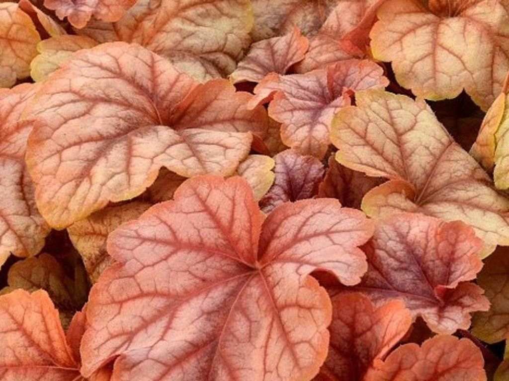 Heuchera 'Buttered Rum' – ein kompakt wachsender Heuchera-Kultivar, der einen polsterartigen Horst bildet. Der Kultivar 'Buttered Rum' wurde von Terra Nova Nurseries in den USA eingeführt und ist durch Züchtungsrechte (PP25040, PBR) geschützt. Er bildet ein kompaktes, leicht immergrünes Kissen aus tief eingeschnittenen Blättern mit ahornanartigem Umriss und leicht gewelltem Rand. Die Austriebsfarbe ist karamellfarben bis kupferfarben, im Sommer geht das Blatt in wärmere Bronzetöne über und färbt sich dann rosa-rot bis ziegelrot, sodass die Pflanze auch bis in den Winter hinein Farbe behält. Die Blätter sind langstielig, glänzend und plastisch geädert, wodurch sie im Halbschatten wie eine kleine Lichtquelle wirken. Der Horst erreicht im Erwachsenenalter eine Höhe von etwa 20–30 cm und eine Breite von 35–45 cm, zur Blütezeit erhebt er sich auf 35–45 cm. Im Mai und Juni trägt er auf dünnen, dunkleren Stielen lockere Rispen von kleinen, cremeweißen Blüten, oft sternförmig, die eine zarte Nektarquelle für Insekten sind. In Kompositionen eignet er sich für die Ränder von Beeten, in schattigeren Bereichen unter Gehölzen sowie in Schotterbeeten mit Humuszusatz, er passt gut zu Bergenien, Farnen, Astilben, Seggen und Storchschnäbeln. In Töpfen bildet er einen regelmäßigen Horst und ergänzt Herbstpflanzungen gut.