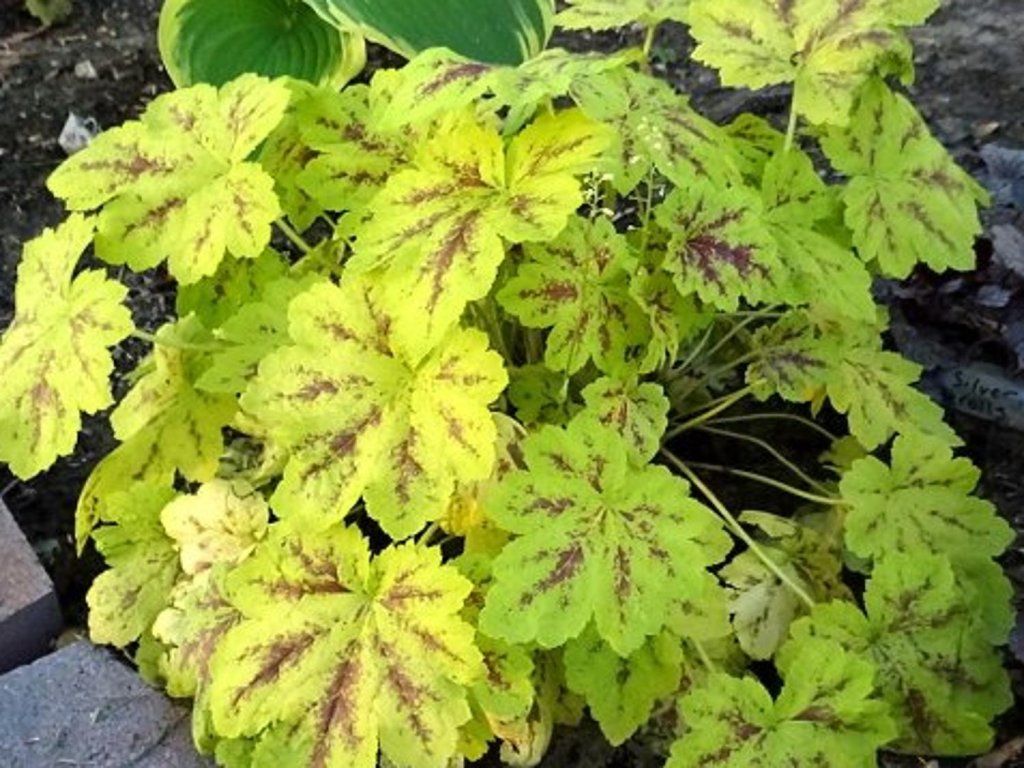 Heuchera 'Solar Power' (PVR) - Wird bis zu 25 cm hoch. Weiße Blüten erscheinen von Juni bis August. Die Blätter sind rundlich, flach mit gezackten Rändern. Große, glänzende Blätter haben eine frischgrüne Färbung mit braun gefärbten Adern. Die Blattfarbe hängt vom Standort ab. Geeignet für die Pflanzung in Gruppen oder als Einfassung und zum Schnitt.