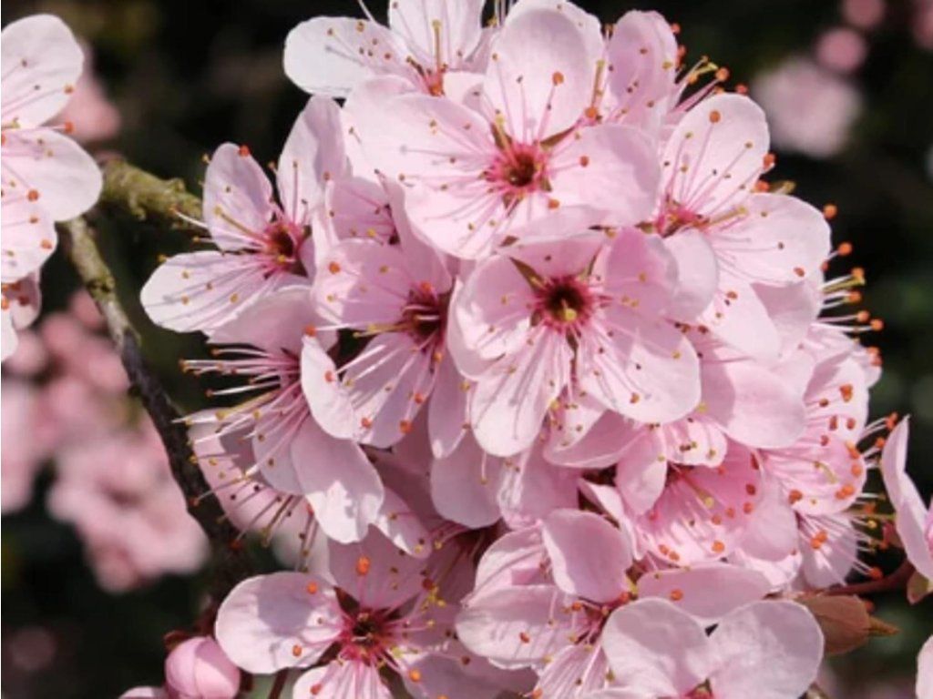 Schwarzdorn 'Purpurea' - ein mittelgroßer, reich verzweigter und dicht dorniger Strauch, der sowohl mit seiner Blüte als auch mit seiner Blattfarbe besticht. Im März und April blüht er mit zarten, hellrosa Blüten, die an Kirschblüten erinnern können. Die Blätter sind lanzettlich, glänzend mit einem dunklen weinroten Schimmer. Der Kontrast wird durch das fast schwarze Holz und die blauen Beeren, die nach der Blüte erscheinen, perfekt ergänzt. Die Früchte sind essbar, aber für den direkten Verzehr recht herb. Geeignet für die Anlage von Hecken oder als schöne Solitärpflanze. Er ist auch eine Attraktion für Bestäuber.