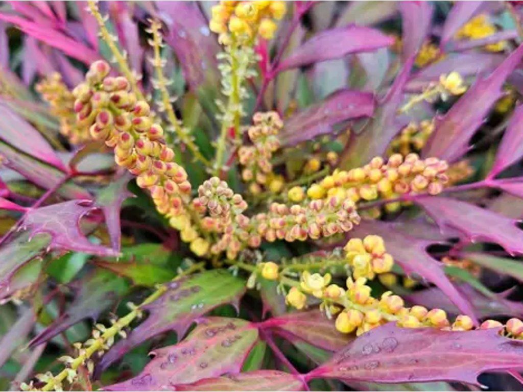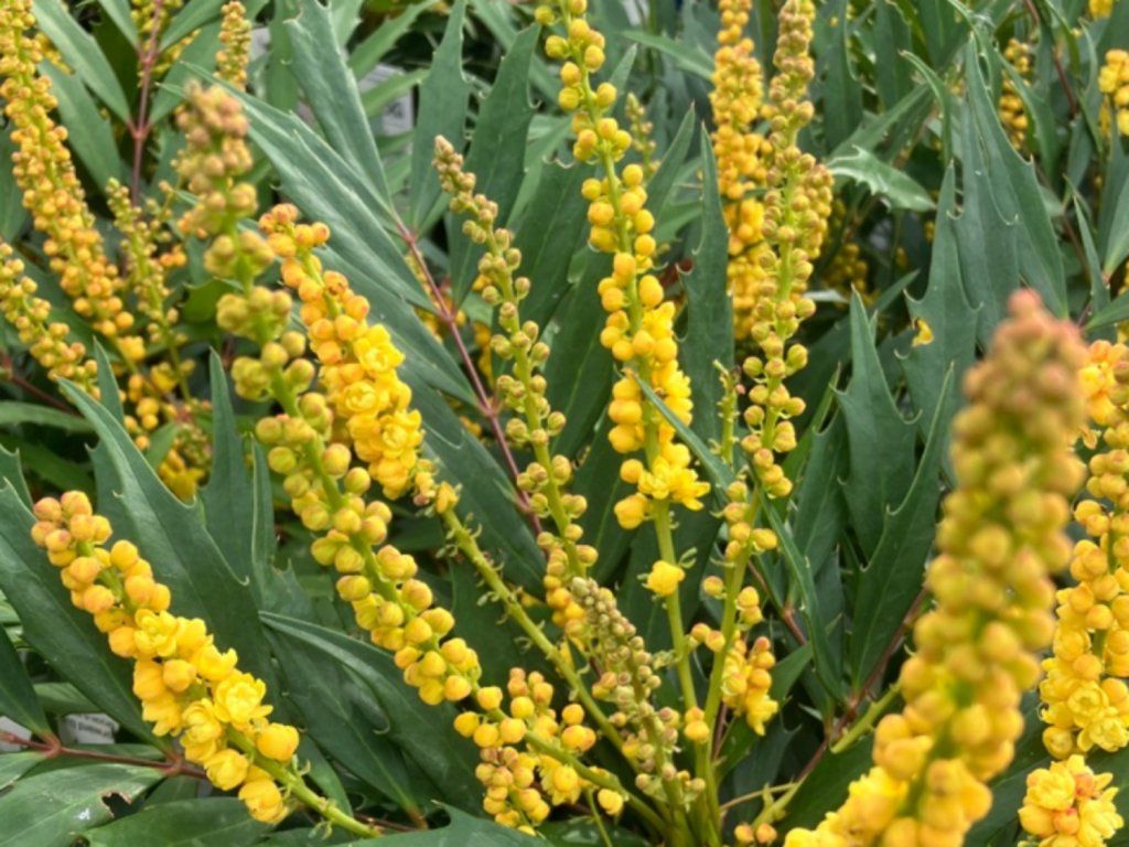 Mahonie 'Meteor' - kompakter, immergrüner Strauch mit dichtem Wuchs und markanten Fiederblättern, die bis zu 30 cm lang werden und das ganze Jahr über dunkelgrün und ledrig bleiben, was dem Garten einen ganzjährigen Zierwert verleiht. Vom späten Frühling bis zum frühen Sommer bilden sich auffällige Blütenstände aus leuchtend gelben Blüten, die in 10–15 cm langen Trauben angeordnet sind und Bestäuber anlocken und dem Garten eine frische Sommernote verleihen. Nach der Blüte bilden sich dunkelblau-schwarze Beeren mit einem Durchmesser von 0,8–1 cm, die für Vögel und Kleintiere attraktiv sind. Der Strauch erreicht eine Höhe von 1–1,5 m und eine Breite von etwa 1 m, wodurch er eine kompakte und gut verzweigte Wuchsform bildet, die sich für Gruppenpflanzungen, zur Wegbegrenzung oder als Solitär eignet. Er ist frostbeständig bis ca. −15 °C, benötigt keine komplizierte Pflege und gehört zu den anspruchslosen Ziersträuchern, die mit ihren auffälligen Blüten und attraktiven Früchten bestechen. Die Pflanze ist beim Verzehr giftig, aber visuell attraktiv.