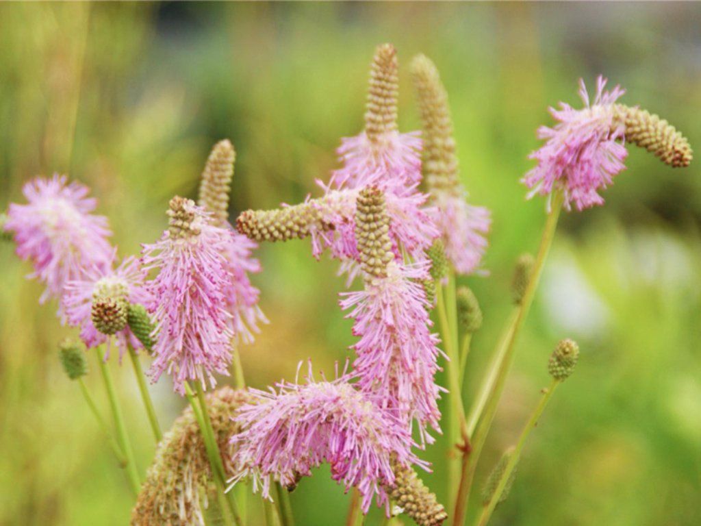 Sanguisorba obtusa 'Pink Brushes' - dank seiner ungewöhnlichen Blütenstände ist er eine sehr beeindruckende Staude. Er erreicht eine Höhe von etwa 90 - 120 cm. Der Gesamthabitus ist aufrecht bis bogenförmig überhängend. Die Blätter sind gefiedert, abfallend, gekerbt und frischgrün. Seine Stängel sind schlank, verzweigt und tragen endständige Ähren mit winzigen, flauschigen Blüten und auffälligen Staubblättern. Die Blüten sind rosafarben und der gesamte Blütenstand ähnelt einem Elefantenrüssel oder einem Tausendfüßler. Die Blütezeit ist von Juli bis August. Die Pflanze ist für den Schnitt geeignet. In einer Stauden- oder Mischpflanzung wird sie sicherlich hervorstechen.