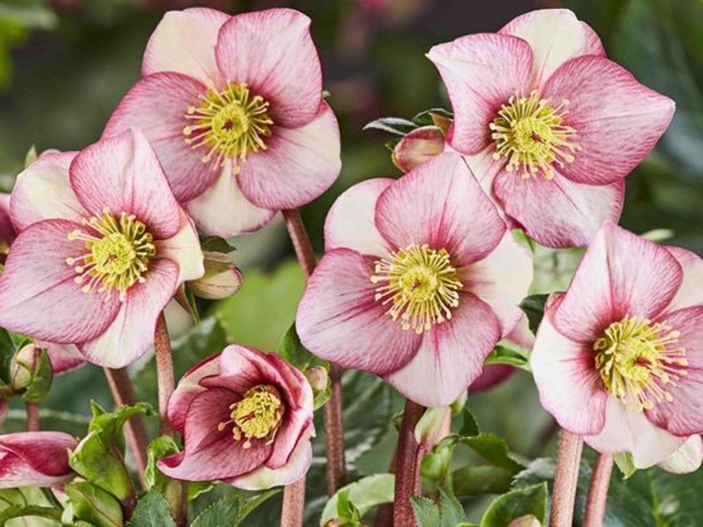 Christrose 'HGC® Ice n' Roses Carlotta' - eine sehr auffällige und dekorative Pflanze, die blüht, wenn die meisten Pflanzen noch schlafen. Die Blätter wachsen aus einem Büschel, sind immergrün und ledrig, dunkelgrün. Kann eine Höhe von etwa 50 - 60 cm erreichen. Aufrechte Blütenstiele tragen wunderschöne, weiße Blüten mit dunkelrosa bis bordeauxrotem Rand und einem gelbgrünen Zentrum, das aus sichtbaren Staubgefäßen besteht. Abhängig vom Wetter blüht sie von Anfang Dezember bis April. Sie blüht sehr lange. Sie ist schön und pflegeleicht. Geeignet für Gruppenpflanzungen. Sie kommt gut in Kombination mit Kuhschellen, Lungenkraut und Zwiebelblumen zur Geltung. Sie wird in Behältern, die in der Nähe von Eingangstüren und auf Terrassen platziert sind, sehr dekorativ wirken.