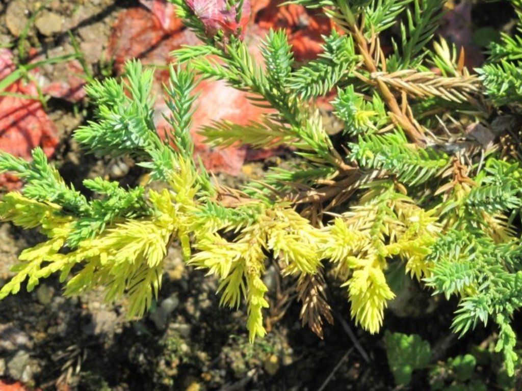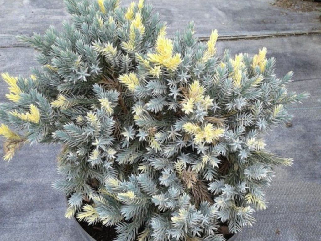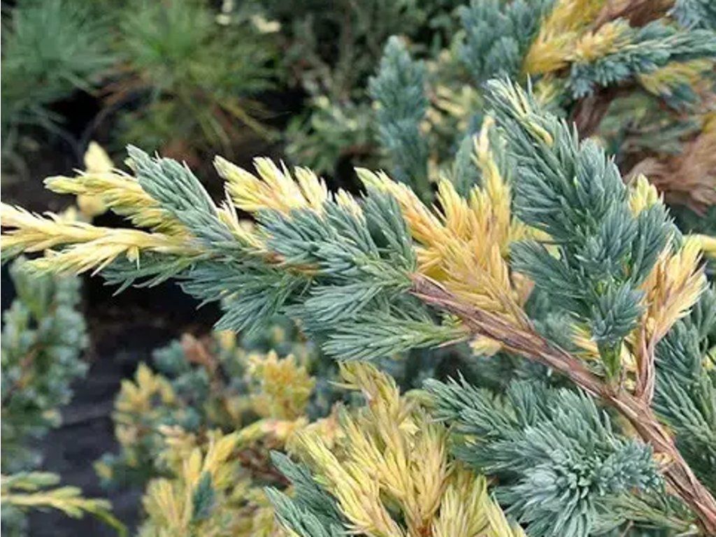 Zwerg-Wacholder 'Golden Flame' - ein ungewöhnlicher Wacholder, der vor allem durch seine zweifarbigen Nadeln besticht. Die Grundfarbe ist grün-blau, die Triebe haben eine leuchtend cremefarbene Gelbfärbung. Die Nadeln sind eng lanzettlich geformt, einige Zweige können gelb gefärbt sein. Die Verzweigung ist dicht, die Form ist halbkugelförmig. Er wächst bis zu einer Höhe von etwa 1 m und einer Breite von 1,2 m. Die jährlichen Zuwächse liegen bei etwa 15 - 20 cm. Ideal für die Pflanzung auf Steingärten, an Hängen oder in Trockenmauern. Er kann auch als attraktiver Solitär auf kleineren Flächen verwendet werden. Dank seiner Färbung und Größe eignet er sich für die Kultur in Gefäßen auf Terrassen und Balkonen.