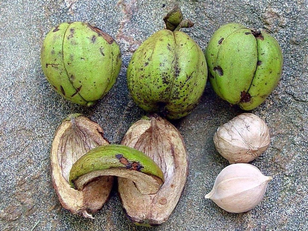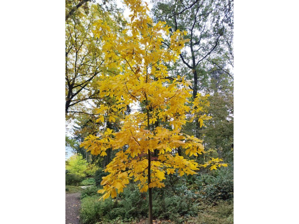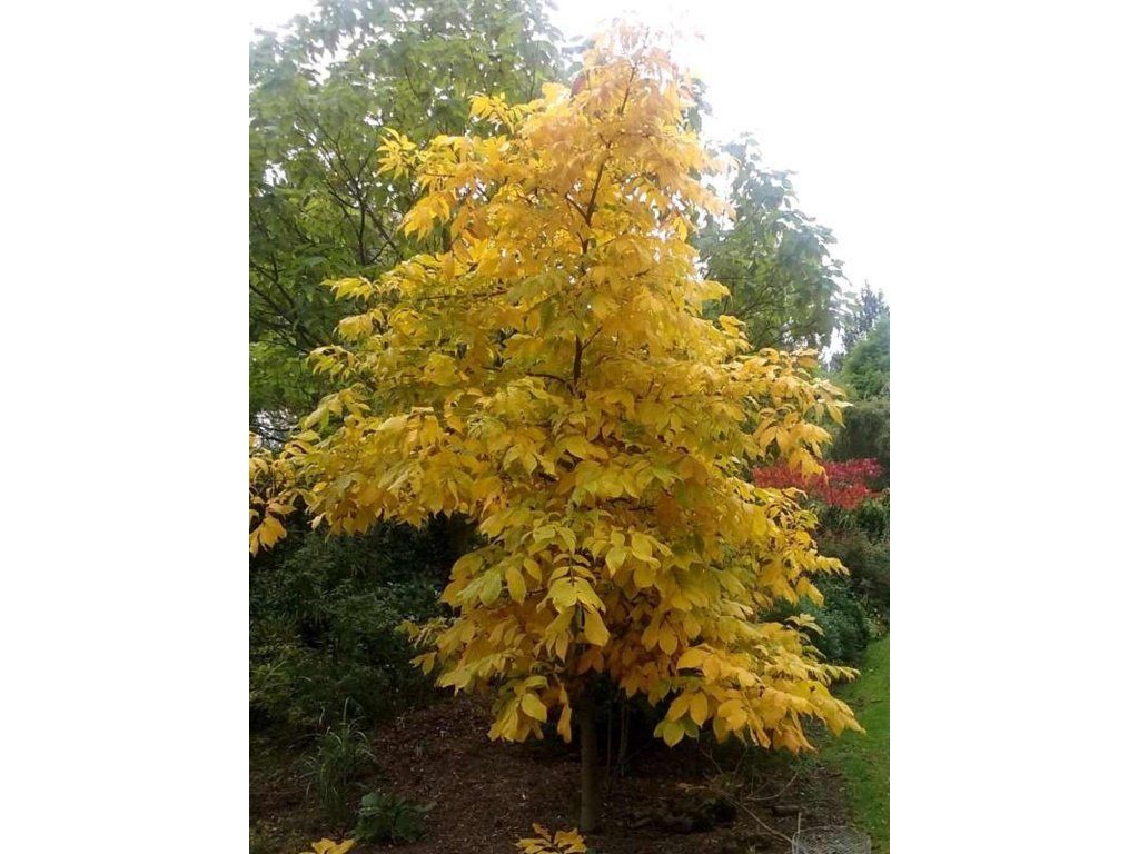 Carya ovata - ein mächtiger Laubbaum aus Nordamerika, wo er einen natürlichen Bestandteil von Mischwäldern bildet. Er erreicht eine Höhe von 25 bis 30 Metern, manchmal auch mehr, und zeichnet sich durch eine charakteristische, schuppig abblätternde Rinde in langen Streifen aus. Die Blätter sind unpaarig gefiedert, meist aus fünf Fiederblättchen bestehend, frischgrün gefärbt, verfärben sich aber im Herbst leuchtend gelb. Der Baum blüht im Frühjahr unauffällig, die männlichen Blüten bilden herabhängende Kätzchen, während die weiblichen Blüten an den Enden junger Triebe wachsen. Die Frucht ist eine runde bis eiförmige Steinfrucht mit einer dicken Fruchthülle, die sich bei Reife im Herbst öffnet und eine harte Schale mit einem schmackhaften, süßaromatischen Kern freilegt. Die Nüsse werden sowohl zum direkten Verzehr als auch in der Küche geschätzt, und der Baum gilt als eines der schmackhaftesten nordamerikanischen nussragenden Gehölze. Carya ovata ist ein langlebiges, widerstandsfähiges und dekoratives Gehölz, das nicht nur nutzbringend, sondern auch als imposanter Solitär in Parks und großen Gärten angebaut wird.