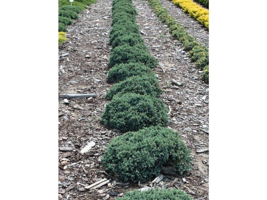 Anbau: Für den Anbau unter unseren Bedingungen wird volle Sonne empfohlen, wo die Pflanze ihre ausgeprägteste Färbung behält. Sie verträgt auch lichten Halbschatten, das Wachstum ist jedoch lockerer und die Farbe weniger intensiv. Am besten gedeiht sie in durchlässigem, eher leichtem bis mittlerem Boden mit einem pH-Wert von 6,0-7,0. Entscheidend ist die Drainage, da Wacholder keine langfristige Staunässe verträgt. In schwereren Böden ist es ratsam, Sand oder Kies hinzuzufügen. Pflanzen werden von März bis November gepflanzt, solange der Boden nicht gefroren ist. Für die Schaffung eines dichten Bestandes werden normalerweise 2-3 Pflanzen je m² verwendet, abhängig von der Geschwindigkeit, mit der die Fläche bedeckt werden soll. Nach der Pflanzung ist eine mäßige Bewässerung ratsam, nach dem Einwurzeln ist die Pflanze gut trockenresistent. Die Frostbeständigkeit reicht bis ca. -28 °C, was eine zuverlässige Überwinterung in allen Regionen des Landes ermöglicht. Die Pflege ist minimal, normalerweise reicht es aus, beschädigte oder ältere Äste zu entfernen und das natürliche Wachstum beizubehalten. Zur Reduzierung der Verdunstung und des Unkrautwuchses wird eine dünne Schicht aus Kies oder Rindenmulch empfohlen. Wacholder kann bei übermäßiger Feuchtigkeit anfällig für Pilzkrankheiten sein, Prävention ist ein luftigerer Standort und Vermeidung von Staunässe. Beim Anbau in Gefäßen gedeiht er in durchlässigem Substrat für Nadelgehölze mit dauerhafter Drainage.