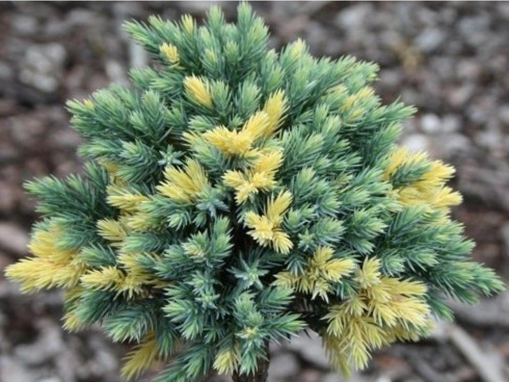 Schuppen-Wacholder 'Floreant' - eine Gebirgsart aus dem Himalaya und Westchina, wo sie auf steinigen Hängen mit schneller Wasserableitung wächst. Die Sorte 'Floreant' gehört zu den langsam wachsenden, kompakten Formen. Sie bildet einen dichten, kissenförmigen Strauch mit kurzen, steifen, blaugrünen bis silbrigen Nadeln, die an den Triebspitzen oft heller, cremefarben panaschiert sind. Unter tschechischen Bedingungen erreicht sie in zehn Jahren eine Höhe von etwa 0,3 m und etwa 0,5 m Breite, wächst allmählich zur Seite und bleibt natürlich kompakt. Im Frühling, im April bis Mai, erscheinen unauffällige Pollenzapfen, der Pollen wird vom Wind verbreitet. Die Gattung Juniperus ist überwiegend zweihäusig, sodass die dekorativen blauen Zapfen nur an weiblichen Pflanzen in Anwesenheit eines männlichen Bestäubers in der Nähe gebildet werden können. Die Nadeln sind beim Zerreiben harzig-aromatisch. 'Floreant' lässt sich gut mit hellen Steinen, niedrigen Fetthennen, Thymian oder kleinen Gräsern kombinieren, wo sie ein ruhiges, immergrünes Fundament bildet. Dank ihres langsamen Wachstums und ihrer Anspruchslosigkeit ist sie ideal für kleine Gärten, moderne Pflanzungen und Steingärten.