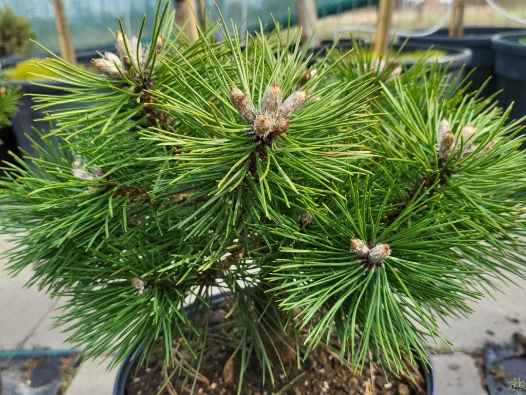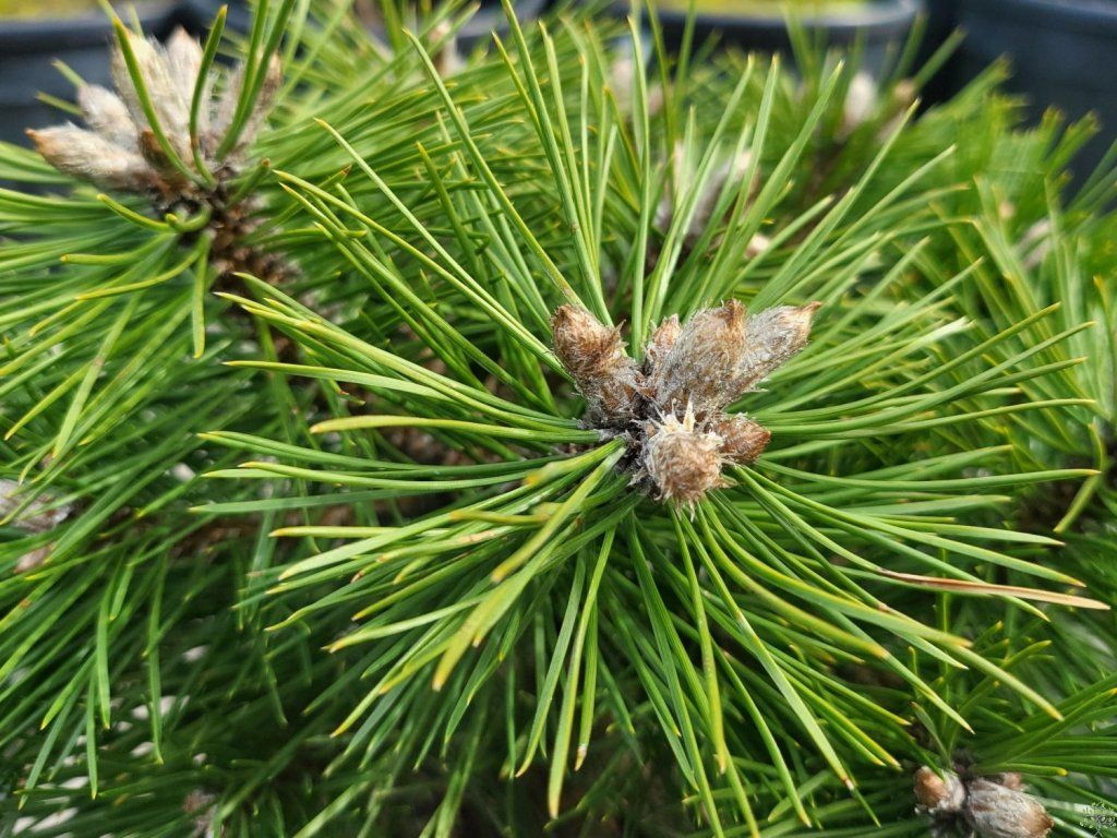 Schwarzkiefer 'Agnes Bregeon' - eine Zwergform der Schwarzkiefer, einer Art, die in Süd- und Mitteleuropa natürlich vorkommt und trockene Hänge, felsige Hänge und Kalkböden besiedelt. In der Natur erreicht die Pinus nigra beträchtliche Größen, aber die Sorte 'Agnes Bregéon' wurde wegen ihres sehr langsamen Wachstums und ihres kompakten, kugelförmigen Habitus ausgewählt. Im Erwachsenenalter erreicht sie eine Höhe von etwa 0,6–0,8 m und eine Breite von etwa 0,8–1 m. Die Krone ist dicht, regelmäßig und von der Basis an verzweigt, was eine feste, architektonische Form ohne Eingriff schafft. Die Nadeln wachsen zu zweit in Büscheln, sind 6–8 cm lang, steif, dunkelgrün und leicht glänzend. Dank der dichten Anordnung wirkt die Pflanze das ganze Jahr über kompakt und bildet ein stabiles, immergrünes Element. Zapfen erscheinen eher bei älteren Exemplaren, sind kleiner, braun und reifen im zweiten Jahr. Die Sorte findet Anwendung in Steingärten, Heidegärten, kleineren Gärten sowie in Kübeln auf Terrassen, wo sie mit ihrer regelmäßigen Silhouette Stauden- und Steinkompositionen ergänzt.