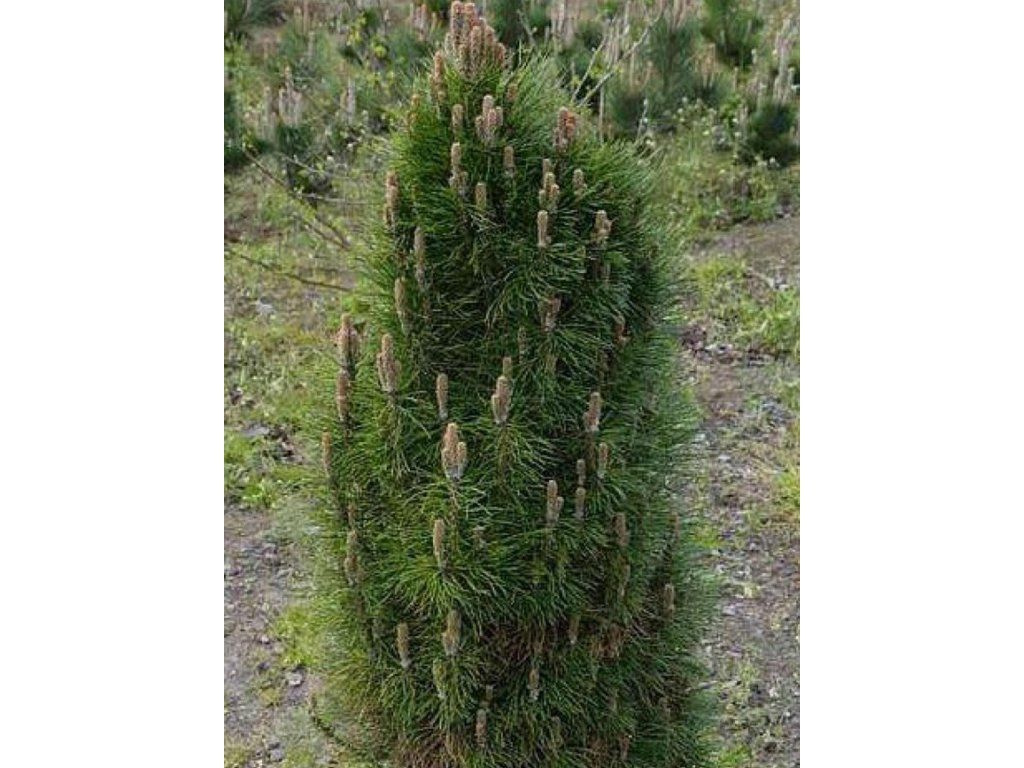 Schwarzkiefer 'Felek' - stammt aus sonnigen, oft kalkhaltigen Hängen Süd- und Mitteleuropas, wo sie auf trockenen, steinigen Böden wächst und windiges sowie städtisches Umfeld verträgt. In der Tschechischen Republik wird die Art seit langem in der Forstwirtschaft und im Ziergartenbau als widerstandsfähiger Nadelbaum für anspruchsvollere Bedingungen eingesetzt. Die Sorte Pinus nigra 'Felek' gehört zu den Zwergformen, die langsam wachsen. Sie bildet einen schmalen, pyramidenförmigen Habitus mit kurzen, schlanken Trieben, die steil nach oben gerichtet sind und mit der Zeit die Krone zu einem dichten, schmalen Kegel formen. Nach zehn Jahren erreicht sie eine Höhe von etwa 1,2 m und eine Breite von 0,5 m, im höheren Alter normalerweise etwa 2–3 m Höhe und 1–1,5 m Breite, je nach Standort. Die Nadeln sind lang, dunkelgrün, steif, zu zweit in Büscheln, mit einer leicht glänzenden Oberfläche. Bei einem Teil der Pflanzen erscheinen zwischen den grünen Nadeln einzelne strohgelbe Nadeln, die der Krone leicht verteilte Lichtakzente verleihen, ohne einen auffällig bunten Eindruck zu erwecken. Im Frühjahr trägt sie kleine männliche Zapfen, die im Mai den von Bienen genutzten gelben Pollen freisetzen, weibliche Zapfen sind kleiner, braun und ergänzen eher das Gesamtbild des Baumes. Dank seines schlanken Wuchses und langsamen Wachstums eignet sich der Kultivar für kleinere Stadtgärten, Vorgärten, Steingärten, Heidekompositionen und niedrige Gruppen mit anderen Nadelbäumen. Er kommt gut als vertikaler Akzent zwischen niedrigeren Stauden und Gräsern zur Geltung, in Kombination mit Wacholder, Zwergkiefern und immergrünen Laubgehölzen.