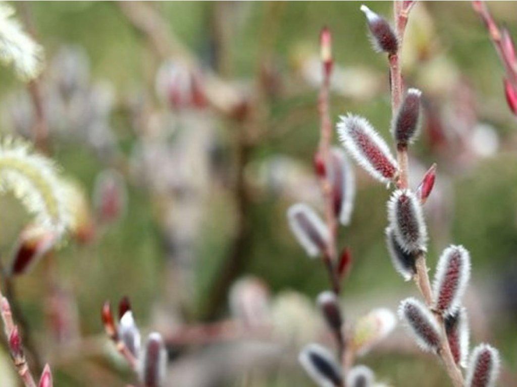 Salix gracilistyla 'Melanostachys' - dekorativer Laubstrauch, geschätzt für seine ausgeprägten schwarzen Kätzchen und sein kontrastreiches Winterbild. Das Wachstum ist kompakt, der Strauch erreicht normalerweise eine Höhe und Breite von 2,5–3 Metern, manchmal bis zu 4 m bei geeignetem Standort. Die Kätzchen, die sehr früh im Frühling erscheinen, oft schon im Februar oder März vor dem Austreiben der Blätter, haben eine tief purpurschwarze Farbe und auffällige rote Staubgefäße, die mit fortschreitender Pollenreife zu Gelb übergehen. Triebe und Stängel sind dunkel purpurschwarz, was einen interessanten winterlichen und vorfrühlingshaften Akzent im Garten setzt. Die Blätter erscheinen erst nach der Blüte, sind eiförmig, dunkelgrün und beim Austreiben manchmal mit einem grünlichen bis gräulichen Hauch, die Unterseite ist heller oder silbrig. Sie ist feuchtigkeitstolerant und gedeiht auch in der Nähe von Wasserflächen oder in Parks mit höherer Bodenfeuchtigkeit. Die Frostbeständigkeit ist hoch und reicht bis ca. –30 °C. Sie eignet sich als Solitärgehölz, markanter Strauch neben einem Gartenweg oder an einer Wasserfläche, oder als interessantes Element in der Frühlingsbepflanzung. Zweige mit Kätzchen können geschnitten und als dekorativer Schnitt für eine Vase verwendet werden, die schwarzen Kätzchen darauf stellen ein Zierdetail im Innenraum und im Garten dar. Sie können sie auch im Topf auf dem Balkon oder der Terrasse anpflanzen.