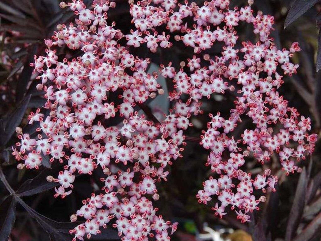 Schwarzer Holunder 'Bad Muskau' - frei wachsender Strauch, der eine Höhe von 2 - 4 m und eine Breite von 1 - 2 m erreicht. Die Blätter sind bis zu 20 cm lang, beim Austrieb dunkelviolett, später purpurgrün. Zarte und duftende Blüten sind hellrosa, die Stiele sind rötlich gefärbt. Sie erscheinen von Ende Mai bis Juni. Violette Beeren reifen im September und sind eine geeignete Nahrungsquelle für Vögel. Dank seiner Färbung ist er ein sehr interessanter Solitärstrauch, aber er kommt auch in Gruppenpflanzungen gut zur Geltung.