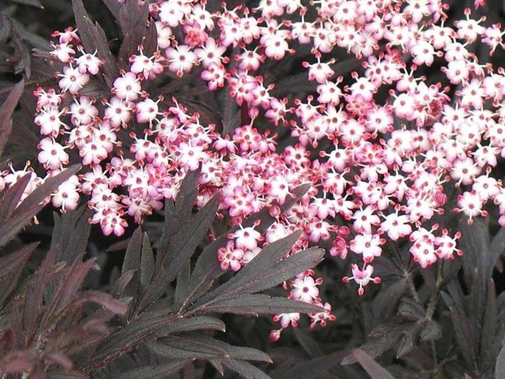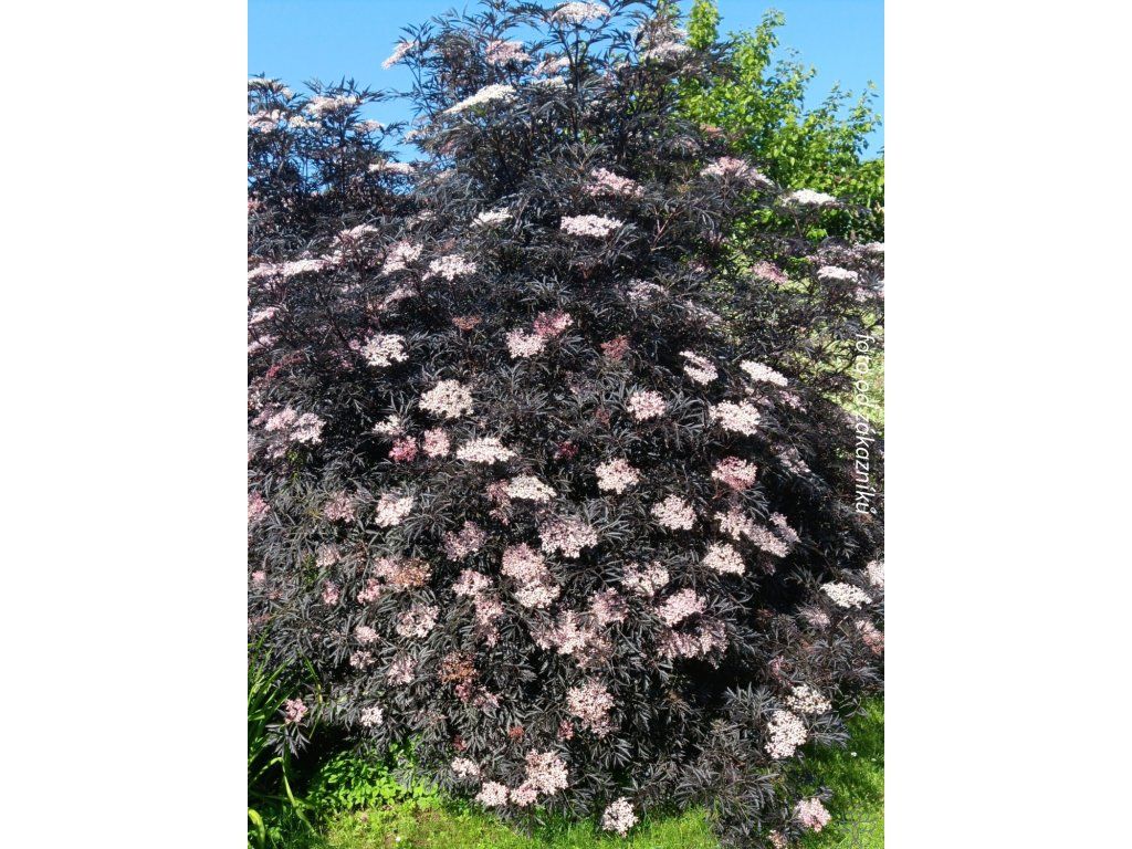 Holunder 'Black Lace' - eine außergewöhnlich dekorative Sorte des Schwarzen Holunders, die sich durch fein geschnittene, dunkelviolette bis fast schwarze Blätter auszeichnet, die an einen Japanischen Fächerahorn erinnern. Er gehört zu den beliebtesten Zier- und Nutzpflanzen dank seines auffälligen Aussehens, seiner Anspruchslosigkeit und seiner essbaren Früchte. Er wächst als mittelstark wuchernder, aufrechter Strauch, der normalerweise 2 bis 3 Meter hoch und ähnlich breit wird. Das Wachstum ist schnell, der Strauch wächst auch nach dem Schnitt gut nach und lässt sich leicht formen. Die Blätter sind tief eingeschnitten, fein, von satt dunkler Farbe, die an einem sonnigen Standort am ausgeprägtesten ist. Nach der Blüte ziehen die Blätter oft teilweise ein. Sie sind rosafarben-weiß, zart duftend und in flachen Dolden angeordnet. Er wirkt sehr elegant im Kontrast zum dunklen Laub und zieht Bestäuber an. Nach der Blüte reifen schwarze, glänzende Beeren, die nach Wärmebehandlung essbar sind und sich für Säfte, Sirupe, Marmeladen und Wein eignen. Er ist voll frostbeständig, widerstandsfähig gegen Krankheiten und städtische Umgebungen. Er eignet sich als Solitär, in gemischten Strauchgruppen, in modernen und naturnahen Gärten, an Gewässern oder als kontrastierendes Element zu grünblättrigen Gehölzen. Er ist die ganze Saison über attraktiv, im Frühling durch die Blätter, im Sommer durch die Blüten und im Herbst durch die Früchte.