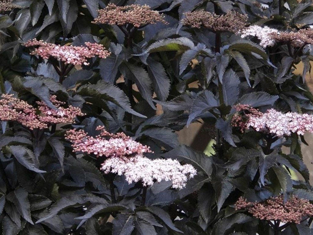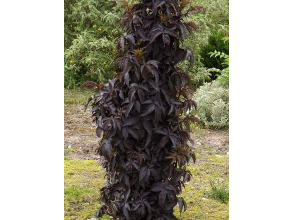 Schwarzer Holunder 'Black Tower' - eine moderne, sehr elegante Sorte des schwarzen Holunders, die sich durch ihr schmal säulenförmiges Wachstum und dunkelviolette bis fast schwarze Blätter auszeichnet. Im Vergleich zu gewöhnlichem Holunder wächst er deutlich aufrecht und eignet sich daher hervorragend auch für kleinere Gärten oder dort, wo ein vertikales Element mit deutlicher Farbwirkung benötigt wird. Er wächst als schlanker, aufrechter Strauch, der normalerweise 2,5 bis 3 Meter hoch wird, dabei aber relativ schmal bleibt, etwa 0,8 bis 1 Meter breit. Das Wachstum ist mittelstark, der Strauch behält natürlich seine säulenförmige Form und muss nicht oft geformt werden. Die Blätter sind tief geteilt, fein, ähnlich der Sorte ‘Black Lace’, aber das Ganze wirkt strenger und architektonischer. Nach der Blüte ziehen die Blätter oft teilweise ein. Sie sind rosa-weiß, flach, leicht duftend, in Dolden angeordnet und bilden einen schönen Kontrast zum dunklen Laub. Sie sind für Bienen und andere Bestäuber attraktiv. Nach der Blüte reifen glänzend schwarze Früchte, die nach Wärmebehandlung essbar sind und sich für Säfte, Sirupe, Marmeladen oder Wein eignen. Er ist voll frostbeständig, widerstandsfähig gegen Krankheiten und städtische Umgebungen. Er ist ideal als Solitärpflanze, für enge Räume, moderne Gärten, Vorgärten, Zäune oder Mauern oder als markanter vertikaler Akzent in gemischten Pflanzungen. Dank seiner säulenförmigen Wuchsform und des dunklen Laubes wirkt er sehr elegant und gleichzeitig modern.