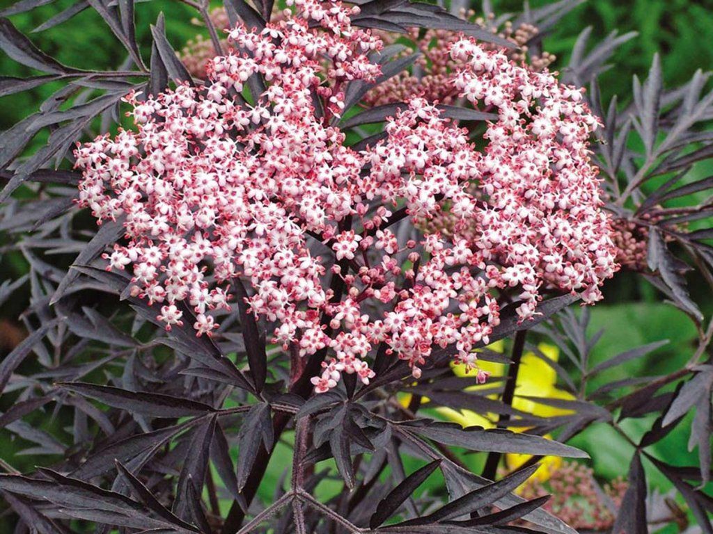 Schwarzer Holunder Black Lace 'Eva' - frei wachsender Strauch, der eine Höhe von 2–3 m und eine Breite von 1–2 m erreicht. Die Blätter sind bis zu 20 cm lang, bei Austrieb dunkelviolett, später purpurgrün. Zarte, duftende Blüten sind hellrosa, die Stiele haben eine rötliche Farbe. Sie erscheinen von Ende Mai bis Juni. Violette Beeren reifen im September und sind eine geeignete Nahrungsquelle für Vögel. Als Solitärpflanze kommt er wunderschön zur Geltung.