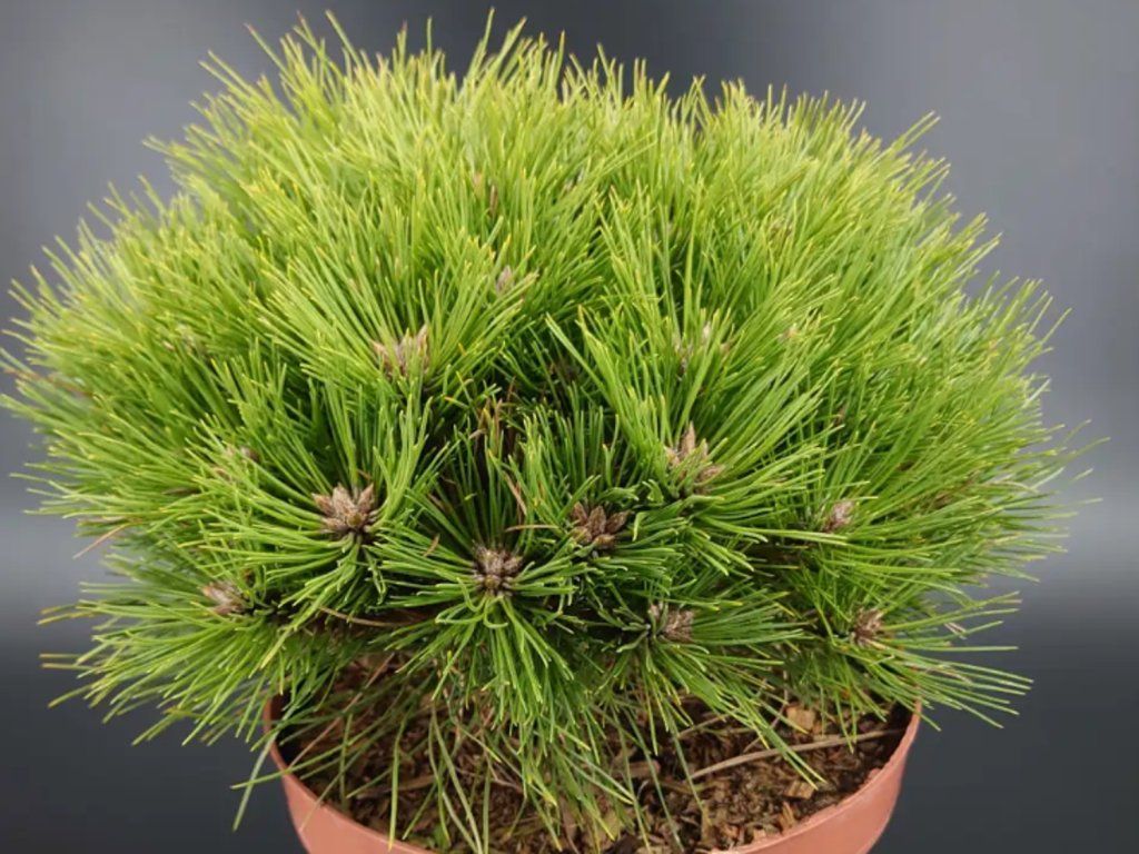Schwarzkiefer 'Marie Bregeon' - eine Zwergform, die in der Schweiz von Henri Bregeon als kontrollierte Kreuzung aus Schwarzkiefer und Dichtblättriger Kiefer gezüchtet wurde. Sie gehört zu den langsam wachsenden Nadelgehölzen, der jährliche Zuwachs beträgt etwa 5–9 cm, nach zehn Jahren erreicht sie eine Höhe von ca. 0,5 m und eine Breite von 0,6–0,7 m, im Erwachsenenalter üblicherweise 0,8–1 m Höhe und etwa 1 m Breite. Die Krone ist natürlich kugelförmig bis flach halbkugelförmig, sehr dicht und kompakt, ohne Bedarf an Formschnitt, die Äste sind kurz und reich verzweigt, wodurch ein zusammenhängendes grünes Kissen entsteht. Die Nadeln, etwa 8–10 cm lang, sind weicher als bei der gewöhnlichen Schwarzkiefer, erbsengrün bis hellgrün, oft leicht spiralförmig gedreht, was der Krone ein fein modelliertes Aussehen verleiht und 3–4 Jahre an den Trieben verbleibt, sodass die Pflanze auch im Winter nicht nach innen austrocknet. Blüten und kleine Zapfen sind unauffällig und für den Zierwert des Gehölzes von geringerer Bedeutung. Die Schwarzkiefer bildet keine Dornen und gilt im Allgemeinen nicht als giftig. Die Sorte 'Marie Bregeon' wird als niedrige Solitärpflanze auf kleineren Rasenflächen, in Heidegärten und Felsbereichen, in japanisch inspirierten und modernen Stadtgärten eingesetzt und bringt dank ihres kompakten Wachstums und ihrer Toleranz gegenüber verschmutzter Luft auch in Kübeln auf Terrassen und an Hauseingängen eine ganzjährige grüne Dominante.