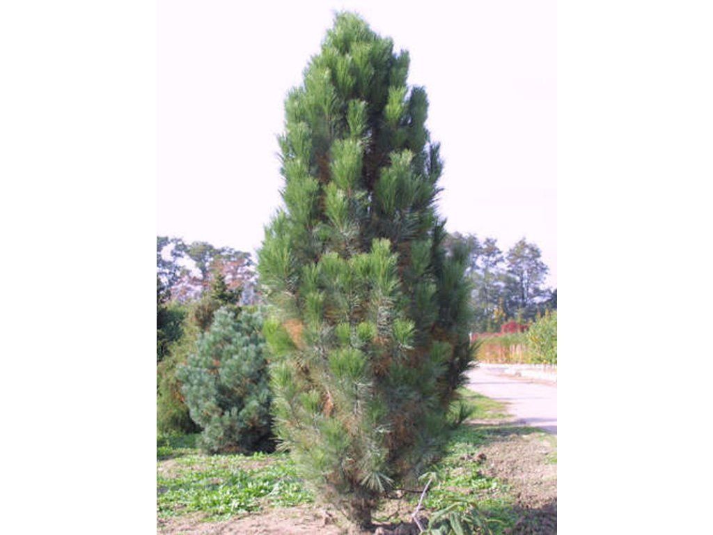 Schwarzkiefer 'Pyramidata/Pyramidalis' - eine ältere Sorte der Schwarzkiefer, die wegen ihres eng pyramidenförmigen bis säulenartigen Wuchses ausgewählt wurde. Die Art Pinus nigra stammt aus den Bergregionen Süd- und Mitteleuropas, wo sie auf steinigen, oft kalkhaltigen Hängen und in trockeneren Wäldern wächst. Die Sorte behält die Widerstandsfähigkeit und Langlebigkeit der ursprünglichen Art, bildet aber eine schmalere und regelmäßigere Krone. Im ausgewachsenen Zustand erreicht sie eine Höhe von etwa 5–8 m und eine Breite von 2–3 m. Das Wachstum ist mittelschnell, mit jährlichen Zuwächsen von etwa 20–30 cm. Die Äste sind dicht angeordnet und wachsen schräg nach oben, wodurch eine kompakte, natürlich geformte Silhouette ohne Schnittbedarf entsteht. Die Nadeln wachsen in Büscheln zu zweit, sind 8–12 cm lang, steif, dunkelgrün und leicht glänzend. An älteren Pflanzen bilden sich eiförmige Zapfen von 5–8 cm Länge, die sich braun verfärben. Die Sorte wird als Solitärdominante, in linearen Pflanzungen entlang von Wegen oder Zäunen sowie als immergrüne Kulisse für gemischte Beete eingesetzt. In der Komposition lässt sie sich gut mit Ziergräsern, Lavendel oder niedrigen Sträuchern in hellen Farbtönen kombinieren.