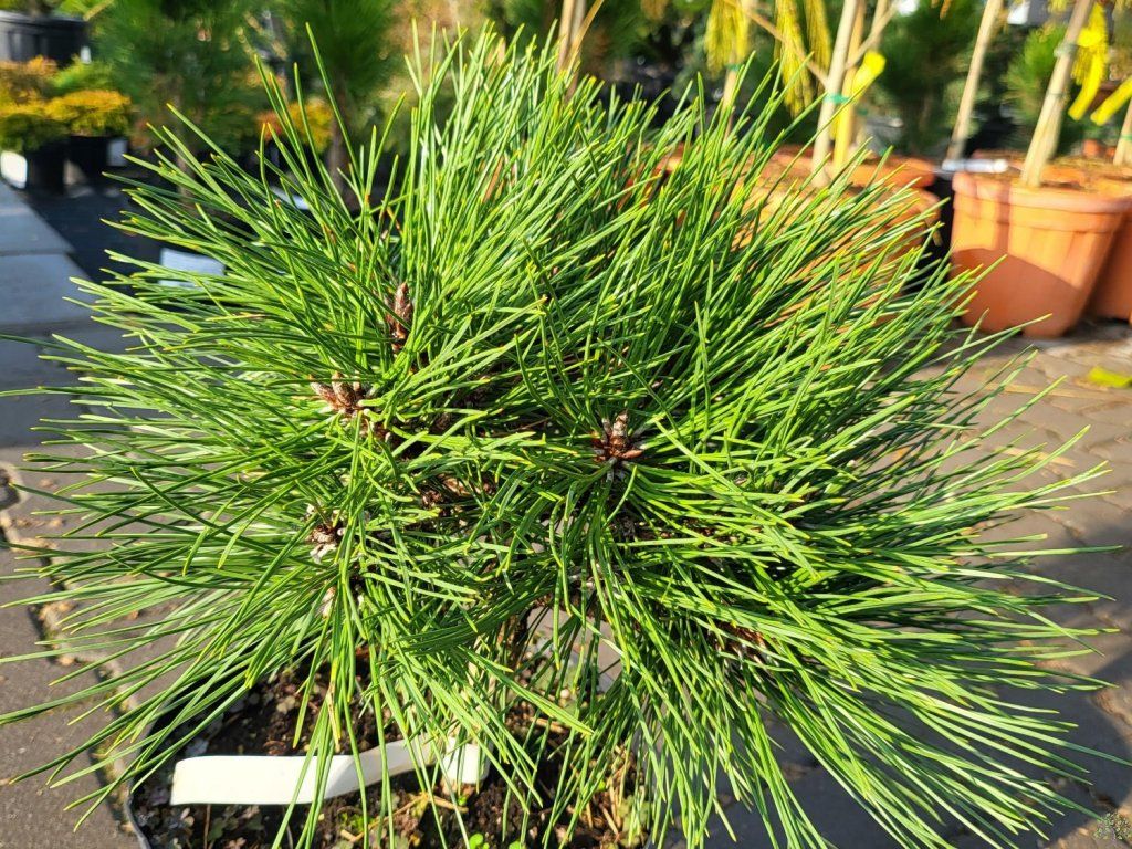 Schwarzkiefer 'SN 18' - eine ausgewählte Sorte der Schwarzkiefer, die sich durch kompaktes Wachstum und dichte Verzweigung auszeichnet. Die Art Pinus nigra stammt aus den Bergregionen Süd- und Mitteleuropas, wo sie auf steinigen, gut durchlässigen Standorten mit oft höherem Kalziumgehalt wächst. Die Sorte 'SN 18' behält die natürliche Widerstandsfähigkeit und Vitalität der Art bei, bildet jedoch eine niedrigere und dichtere Wuchsform aus. Im ausgewachsenen Zustand erreicht sie eine Höhe von etwa 1,5–2 m und eine Breite von 1–1,5 m. Das Wachstum ist mäßig langsam, mit jährlichen Zuwächsen von etwa 10–20 cm. Die Äste sind dicht angeordnet und bilden eine kompakte, natürlich geformte Krone. Die Nadeln wachsen in Büscheln zu zweit, sind 8–12 cm lang, steif, dunkelgrün und leicht glänzend. An älteren Pflanzen können eiförmige Zapfen von 5–8 cm Länge erscheinen, die zu brauner Farbe reifen. Die Sorte wird als Solitärelement in kleineren Gärten, in Steingärten oder als Teil von gemischten Nadelgehölzkompositionen eingesetzt. In Kombination mit Stauden und Ziergräsern schafft sie eine stabile, immergrüne Kulisse.
