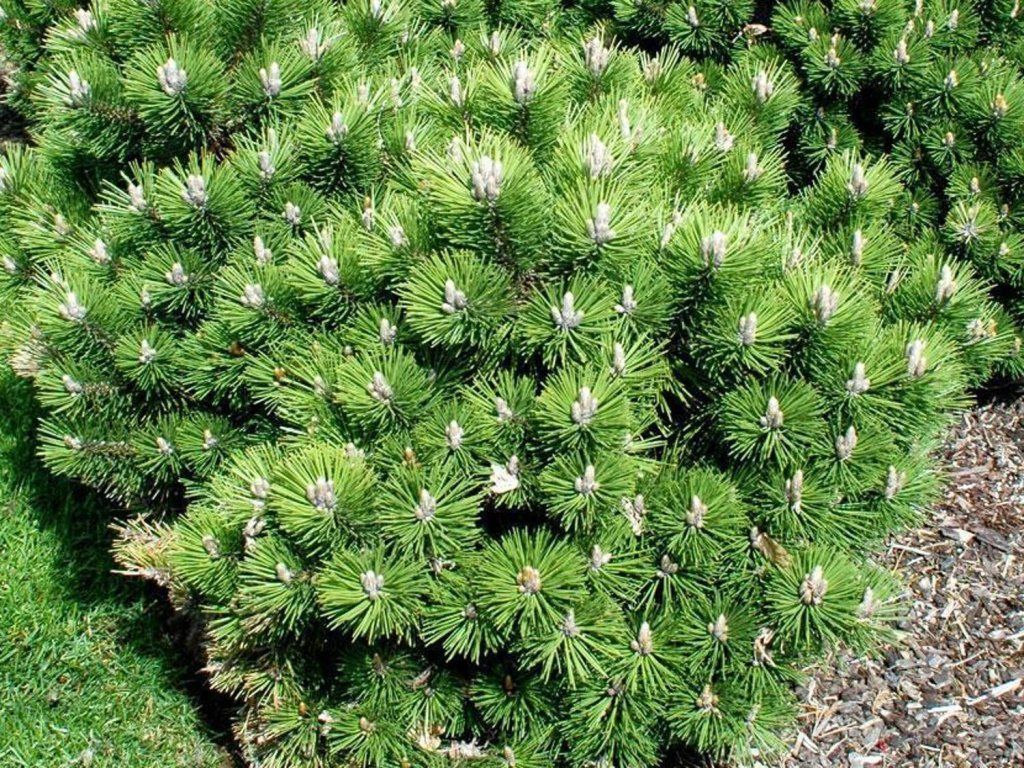 Schwarzkiefer 'Walter' - zwergige, breit kegelförmige Sorte, die zwar kompakt, aber sympathisch unregelmäßig wächst. Sie hat eine beeindruckende Form, die von Stück zu Stück variiert. Die jährlichen Zuwächse betragen 5-10 cm. Die Nadeln sind dunkelgrün, leicht glänzend, steif und relativ lang 6-10 cm. Die Knospen sind cremeweiß. Sie wächst zu einem breiten Kegel und erreicht in zehn Jahren eine Höhe von etwa 60 cm und eine Breite von 90 cm. Ideal als Dominante für kleinere Steingärten und Vorgärten. Sie eignet sich hervorragend als passende Ergänzung zu größeren Ziersteinen.
