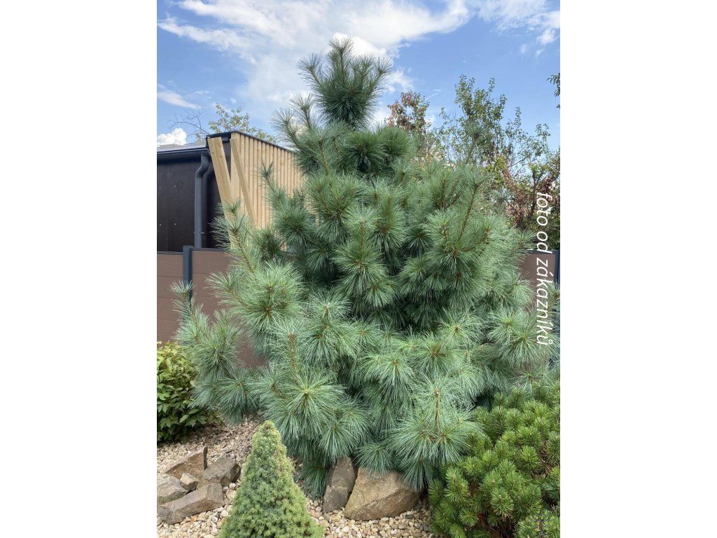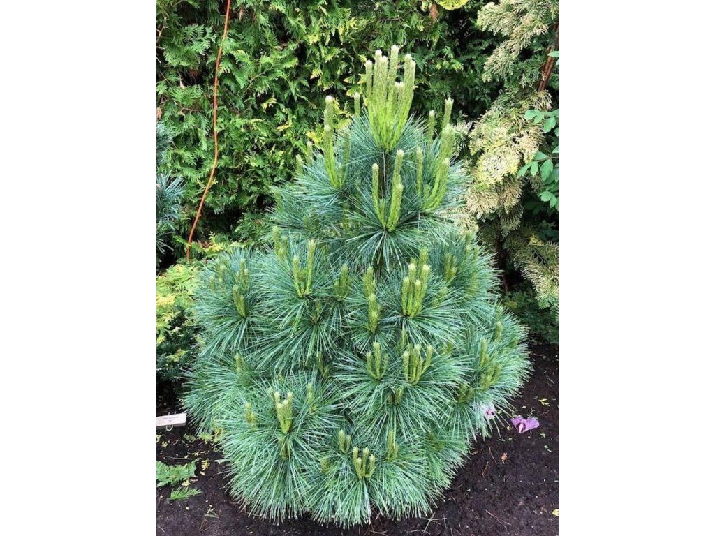Schwerin-Kiefer 'Wiethorst' - gehört zu den Zwergkoniferen, die auch für kleinere Gärten geeignet sind. Es handelt sich um eine Kultivarpflanze einer botanischen Kreuzung aus der Weymouth-Kiefer (Pinus strobus) und der Himalaya-Kiefer (Pinus wallichiana), die feine, lange Nadeln mit guter Kälteresistenz kombiniert. Die Krone wächst dicht und breit kegelförmig, mit einer leicht unregelmäßigen Kontur, behält aber überschaubare Dimensionen. Im Alter von zehn Jahren erreicht sie eine Höhe von ca. 1,5 m und eine Breite von 1–1,2 m, im ausgewachsenen Zustand üblicherweise 2–2,5 m in der Höhe und 1,5–2 m in der Breite, sodass sie keinen normalen Familiengarten überragt. Die Nadeln sind zu fünft angeordnet, weich, hängend, etwa 10–12 cm lang, oberseits blaugrün und unterseits mit silbrigem Schimmer, was der Krone ein zart bereiftes Aussehen verleiht. Relativ bald erscheinen auch längliche, harzige Zapfen, oft in Gruppen, die mehrere Jahre an den Zweigen verbleiben. In der Komposition eignet sich 'Wiethorst' als Solitär in einem Kiesbeet, in einem größeren Steingarten und im Vorgarten. Sie lässt sich sehr gut mit Heidekrautgewächsen, Zwergwacholder, Bergkiefern und Ziergräsern kombinieren, die ihre blaugrüne Farbe und ihre ganzjährige Struktur unterstreichen.