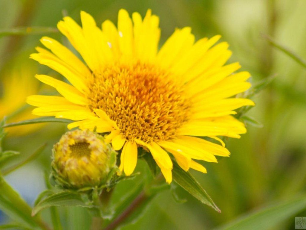 Inula ensifolia - eine horstbildende Staude aus der Familie der Korbblütler (Asteraceae), ursprünglich von warmen und trockenen Steppenhängen und Kalkhängen Mittel- und Südosteuropas bis nach Südwestasien. In der Tschechischen Republik kommt sie natürlicherweise in wärmeren Gebieten auf sonnigen, steinigen Standorten vor. Im Garten wächst sie zu einem kompakten, kissenartigen Horst heran, der normalerweise 25–35 cm hoch und 25–35 cm breit ist, mit langsamerem, aber stetigem Wachstum zu breiteren Polstern. Die Blätter sind schmal bis schwertförmig, ganzrandig, steifer, tiefgrün; bei mildem Winter kann ein Teil des Laubes bis ins Frühjahr erhalten bleiben. Auf fest belaubten Stängeln erscheinen von Juli bis August einzelne Blütenkörbchen, oft 3–5 cm breit, mit goldgelben Zungenblüten und einem tiefgelben Zentrum. Die Blüten ziehen Bestäuber an und wirken in trockenen Beeten wie kleine Sommerlichter zwischen Gräsern. Dank ihres niedrigen Habitus kommt sie in der vorderen Reihe von Staudenpflanzungen, im Präriestil, in Kies- und Steingartenbeeten, an Trockenmauern und in Kübeln zum Einsatz. In der Komposition harmoniert sie gut mit Katzenminze, Thymian, Salbei, Fetthenne, Schafgarbe, Schwingel und niedrigen Ziergräsern, wo die gelbe Blütenfarbe das blau-graue und silbrige Laub hervorhebt. Die Blütenstiele eignen sich auch für natürliche Arrangements. Die Art bildet kurze Rhizome, sodass sie mit der Zeit den Horst erweitert, aber nicht invasiv ist.