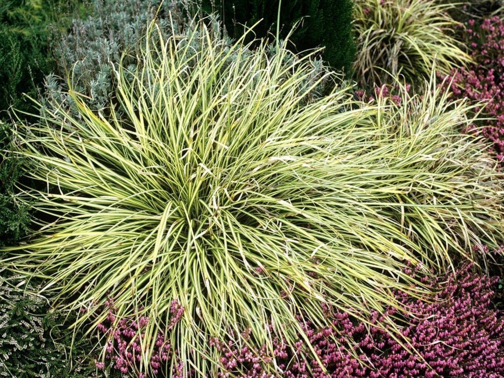 Segge brunnea 'Jubilo' - sehr schönes, niedriges, horstbildendes Ziergras mit relativ schnellem Wachstum. Erreicht eine Höhe von 40 cm. Die schmalen Blätter sind hellgrün mit einem ausgeprägten cremeweiß-gelben Streifen. Der Blütenstand ist eher unscheinbar und blüht von April bis Juni. Die Pflanze eignet sich sowohl für die Pflanzung in Beeten als auch für die Kultivierung in Töpfen.