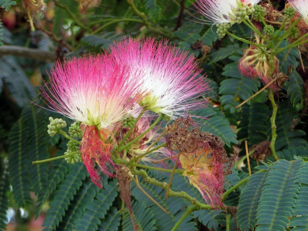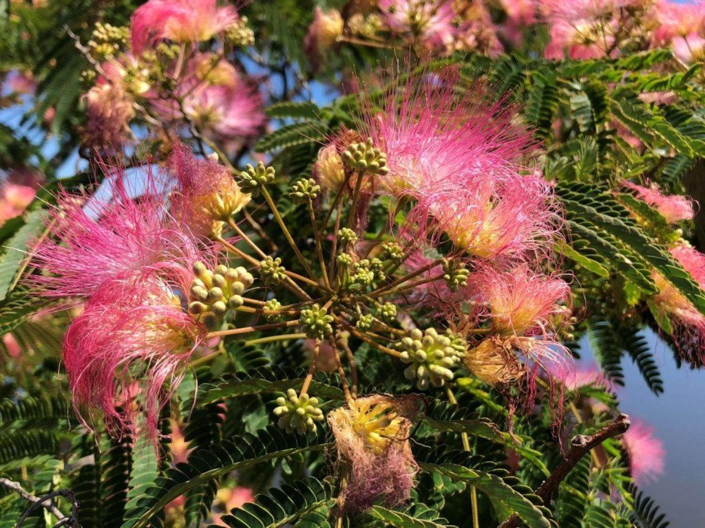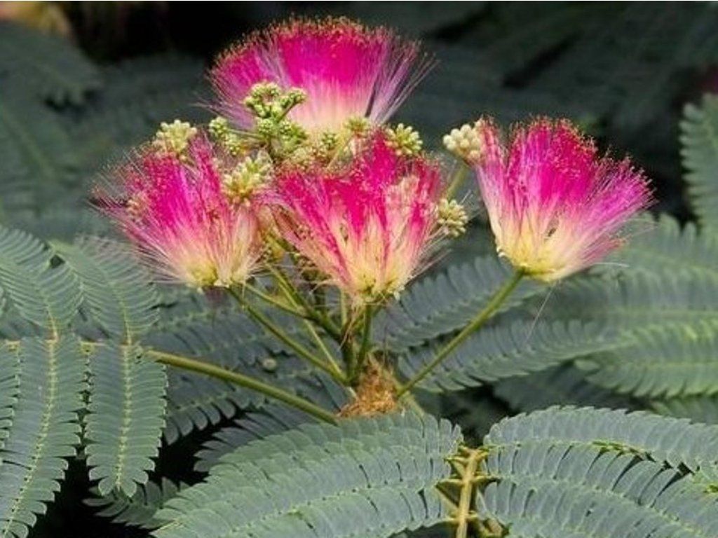 Albizia julibrissin - bekannt als der Persische Seidenbaum, stammt aus den ausgedehnten Gebieten Südwest- und Ostasiens, vom Iran bis nach Japan. Dieser Laubbaum oder höhere Strauch bildet im Erwachsenenalter eine charakteristische, flache, schirmförmige Krone, die eine Breite von bis zu 6 Metern erreichen kann. Die Blätter sind doppelt gefiedert, bis zu 40 cm lang und bestehen aus Dutzenden kleiner Blättchen, die dem Baum ein leichtes und luftiges Aussehen verleihen. Die Blütezeit ist im Juli und August, wenn sich an den Enden der Triebe dichte, rispenförmige Blütenstände bilden. Die einzelnen Blüten haben keine klassischen Blütenblätter; ihre Schönheit bilden Büschel langer, rosafarbener bis karminroter Staubblätter mit weißlicher Basis, die wie Seidenfäden wirken. Die Blüten sind reich an Nektar und duften süß. Die Frucht sind flache, braune Hülsen von etwa 10–15 cm Länge, die auch nach dem Laubfall am Baum verbleiben. Die Persische Akazie wird in der Gartengestaltung als markanter Solitär verwendet, der sich hervorragend mit Pflanzen ähnlicher Ansprüche wie Lavendel, Rosmarin oder Ziergräsern kombinieren lässt. In der traditionellen Medizin asiatischer Kulturen werden sowohl die Blüten als auch die Rinde für ihre beruhigenden Wirkungen und zur Förderung des seelischen Gleichgewichts geschätzt. Sie ist auch als Persische Mimose bekannt und ein Laubbaum, der ursprünglich aus der Region von Asien bis zum Mittelmeerraum stammt. Die Höhe dieses Baumes liegt normalerweise zwischen 5 und 12 Metern, kann aber unter optimalen Bedingungen auch höhere Höhen erreichen. Sie wächst relativ schnell und ist bekannt für ihre breite und ausladende Krone, die angenehm leichten Schatten spendet. Die Blätter des Baumes Albizia julibrissin sind doppelt gefiedert, also aus kleinen Blättchen zusammengesetzt, was ihnen ein zartes und elegantes Aussehen verleiht. Sie sind hellgrün und schließen sich abends oder bei Regen. Die Blätter treiben erst sehr spät im Frühling aus, also keine Sorge, dass die Albizie erfroren ist – sie braucht nur etwas Zeit. Die Blüten des Persischen Mimosenbaums sind charakteristisch und attraktiv. Es sind runde, weiche Blütenstände aus rosaroten Staubgefäßen mit gelben Staubblättern, die einen exotischen Look erzeugen. Sie duften betörend. Sie wird oft wegen ihres dekorativen Aussehens und ihrer attraktiven Blüten gepflanzt. Sie ist beliebt für ihre exotische Schönheit und ihre Fähigkeit, Insekten und Schmetterlinge in den Garten zu locken.