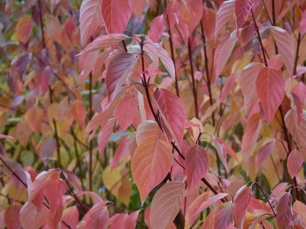 Hartriegel 'Cardinal' - mehrstämmiger, laubabwerfender Strauch mit leuchtend roten Wintertrieben. Er wächst schnell und passt sich den meisten Böden an. Im Frühling und Sommer trägt er eiförmige, dunkelgrüne Blätter, die einen Kontrast zu den Trieben bilden. Ende des Frühlings erscheinen kleine Büschel winziger cremefarbener Blüten, die Schmetterlinge anlocken. Anschließend weichen sie Büscheln kleiner Beeren, oft blau gefärbt. Im Herbst verfärben sich die Blätter in attraktiven Burgunderrot-Tönen. Er erreicht eine Höhe von 180 - 270 cm.