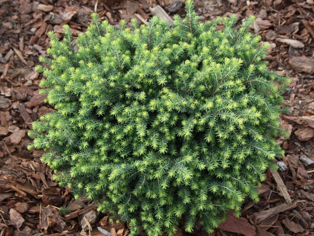 Omorika-Fichte 'Karel' - interessanter Kultivar flach-kugelförmiger, mit grün-silbernen Nadeln und einer sehr dicht verzweigten Krone. Erreicht eine Höhe von etwa 100 cm bei ähnlicher Breite im Laufe von zehn Jahren. Jährliche Zuwächse betragen etwa 8 cm. Er zeichnet sich durch hohe Frostbeständigkeit aus und verträgt verschmutzte Umgebungen gut. Eignet sich hervorragend für kleinere Gärten, aber auch für Steingärten und Ziergefäße.