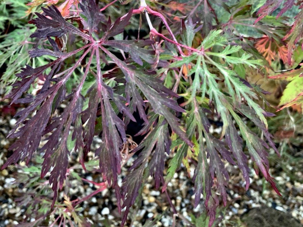 Japanischer Fächer-Ahorn 'King's Copse' - ein langsam wachsender Kultivar, der innerhalb von zehn Jahren eine Höhe von 2 m erreicht. Er hat tief eingeschnittene, mehrfach gefiederte, geaderte Blätter in erbsengrüner Farbe. Im Laufe der Saison wird die Farbe dunkler, im Herbst ist sie dunkelviolett. Er blüht im Mai mit roten Blüten.