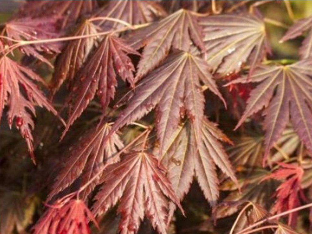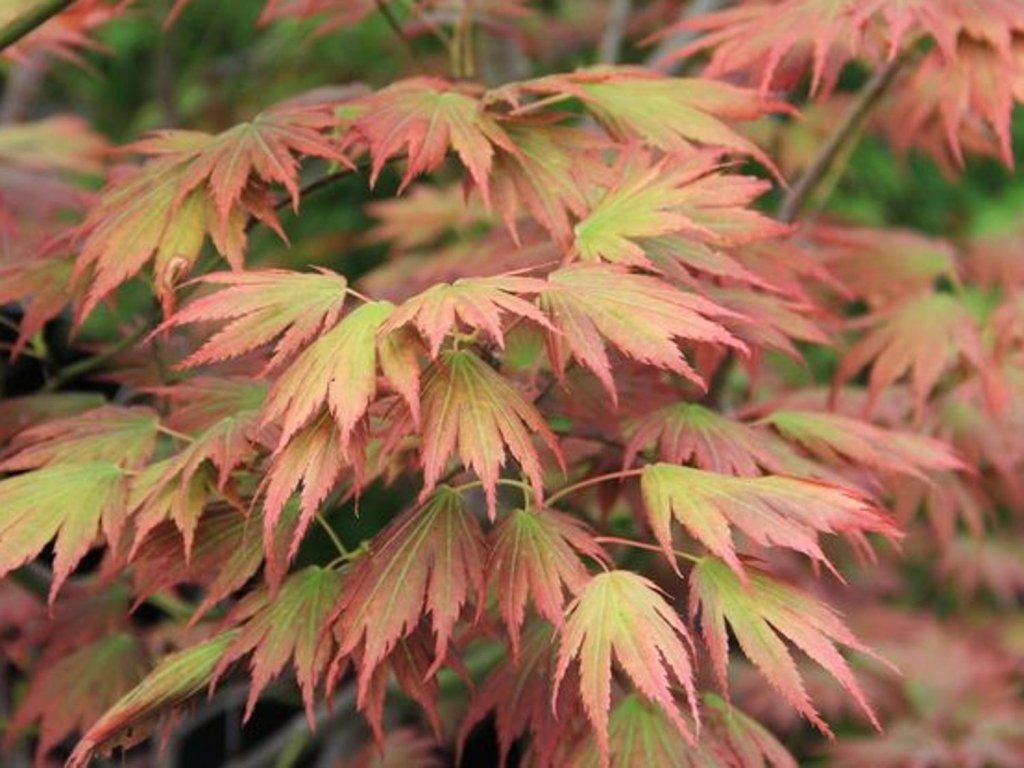 Japanischer Fächerahorn 'Johin' - aufrecht wachsender, eleganter Strauch, der eine Höhe von 1,8-2,4 m und eine Breite von 1,8 m erreicht. Er hat längere, tief eingeschnittene, gelappte Blätter. Austreibende Blätter sind dunkelrot mit auffälligen grünen Adern, die durch das Blatt verlaufen. Im Sommer ist ihre Farbe eher ziegelrot, und im Herbst kommen mehr orange und rote Farbtöne hinzu. Die Blüten sind klein, grünlich und erscheinen im Frühling. Obwohl die Blüten nicht so auffällig sind, haben sie eine angenehme Farbe und ziehen Bestäuber an. Ideal für Gärten, die ein kompaktes, aber visuell interessantes Element benötigen. Seine schönen Blätter, sein sanfter Wuchs und seine Herbstfarben machen ihn zu einer ausgezeichneten Wahl für kleine bis mittelgroße Gärten, wo er das ganze Jahr über Aufmerksamkeit erregen wird.