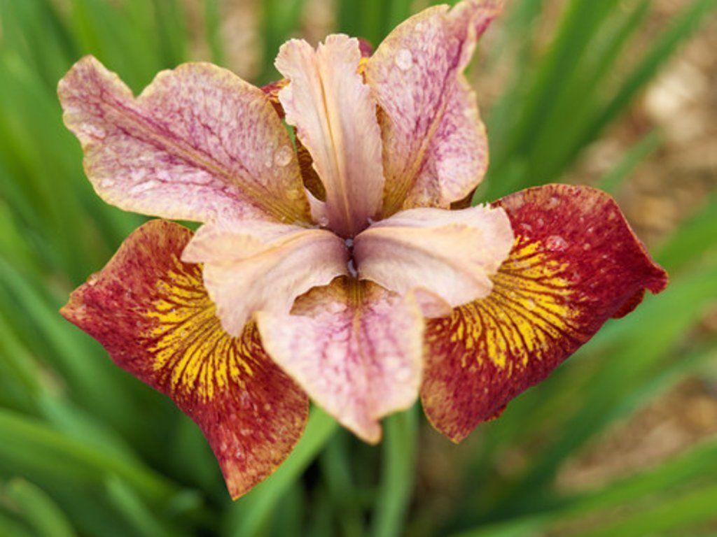 Schwertlilie 'Paprikash' - dieser Kultivar der Sibirischen Schwertlilie erzielt einen absolut einzigartigen Effekt bei minimalem Aufwand. Der Kultivar 'Paprikash' wurde 2012 in den USA von den Züchtern Marty Schafer und Jan Sacks registriert und kann auch unter dem Handelsnamen Peacock Butterfly 'Paprikash' in den Verkauf gelangen. Im Laubaustrieb bildet er einen dichten, langlebigen und nicht-invasiven Horst von etwa 45–55 cm Höhe, der sich allmählich auf 50–60 cm ausdehnt. Von Mai bis Juni wachsen stabile Stiele von etwa 70–90 cm Höhe und tragen mehrere Knospen, sodass die Blüte allmählich erfolgt. Die Blüten sind leicht gewellt und kombinieren eine hellaprikosenfarbene Basis mit rotvioletten Adern und dichtem Sprenkelmuster. Die unteren Blütenblätter tragen paprikarote bis orange-rote Töne mit einem gelben Signal, das die Bestäuber zum Nektar leitet. Der Duft ist meist nur schwach, dennoch werden die Blüten regelmäßig von Bienen und Hummeln besucht. Die Blüte eignet sich auch für den Schnitt, in der Vase hält sie normalerweise einige Tage, und warme Farbtöne kommen besonders vor dunklerem Grün zur Geltung. Nach der Blüte können sich schlanke Samenkapseln entwickeln, und die vertikale Textur der Blätter übernimmt die Hauptrolle, hält die Komposition bis zum Herbst. Farblich kommt sie als warmer Akzent neben blauen und violetten Schwertlilien zur Geltung, passt gut zu Astilben, Farnen, Taglilien, Storchschnäbeln und Ziergräsern, in einem Regengarten fügt sie sich natürlich in Seggen und andere feuchtigkeitsliebende Arten ein.