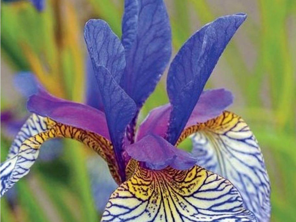 Sibirische Schwertlilie 'Shaker's Prayer' - gehört zu den bartlosen Schwertlilien aus der Gruppe der Iris sibirica, einer Art, die in Europa und den gemäßigten Zonen Asiens verbreitet ist und auf feuchteren Wiesen, in Gräben und Flussauen wächst. Im Sortiment wird sie als Topfpflanze und als geteiltes Rhizom angeboten. Die Sorte wurde von Carol Warner gezüchtet, 1989 registriert und kam Anfang der 90er Jahre in den Handel. Im Garten bildet sie einen kompakten bis leicht ausladenden Horst, der im ausgewachsenen Zustand etwa 40–60 cm breit wird. Die schmalen, mittelgrünen Blätter ähneln feinem Gras und bleiben auch nach der Blüte ansehnlich. Die Stiele sind meist kräftig, üblicherweise 80–110 cm lang, und an einem Stiel öffnen sich nach und nach bis zu 4–5 Blüten. Von Mai bis Juni trägt sie Blüten mit einem Durchmesser von etwa 6–8 cm, bei denen die inneren Blütenblätter blauviolett und aufrecht sind, während die äußeren Blütenblätter einen weißen Grund mit feiner violetter Äderung und einem deutlichen gelben Auge an der Basis haben. Das Muster wirkt wie ein Aquarell, das sich je nach Licht und Morgentau verändert. Der Duft ist meist nicht ausgeprägt, stattdessen besticht sie durch ihr Muster und die Klarheit ihrer Form. Die Blüten werden von Bestäubern besucht, insbesondere von Bienen. Sie findet Anwendung an Wasserelementen, in naturnahen Pflanzungen und in Staudenbeeten mit Taglilien, Ziergräsern, Storchschnäbeln oder Phlox, wo sie eine vertikale Linie und eine feine Blattbewegung hinzufügt. Die Blüten sind auch zum Schnitt geeignet und halten sich in der Vase normalerweise einige Tage. Die Pflanze ist bei Verzehr für Kinder und Haustiere ungeeignet, Vorsicht ist bei der Handhabung geboten.