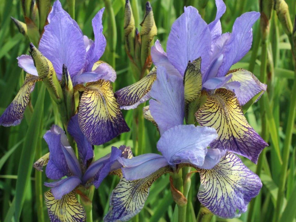 Sibirische Schwertlilie Peacock Butterfly® 'Banish Misfortune': eine Schwertlilien-Sorte aus der Serie Peacock Butterfly®, die sich durch einzigartige, elegante Blüten in den schönsten Farben auszeichnet. Banish Misfortune trägt Blüten in Violetttönen mit kontrastierenden Zeichnungen, an starken und widerstandsfähigen Stielen. Die übliche Höhe liegt im Bereich von 60 – 90 cm. Sie blühen im Mai und Juni. Die Blätter sind typisch für sibirische Schwertlilien - schmal, mittelgrün und wachsen aus einem unterirdischen Rhizom. Schwertlilien gehören aufgrund ihrer Anspruchslosigkeit und ihres ästhetischen Wertes zu den beliebten Pflanzen in Ziergärten und werden gerne in der Nähe von Wasserelementen und an den Rändern von Teichen gepflanzt. Sie werden für ihre Vielseitigkeit und Widerstandsfähigkeit in verschiedenen Landschaftsumgebungen sehr geschätzt.