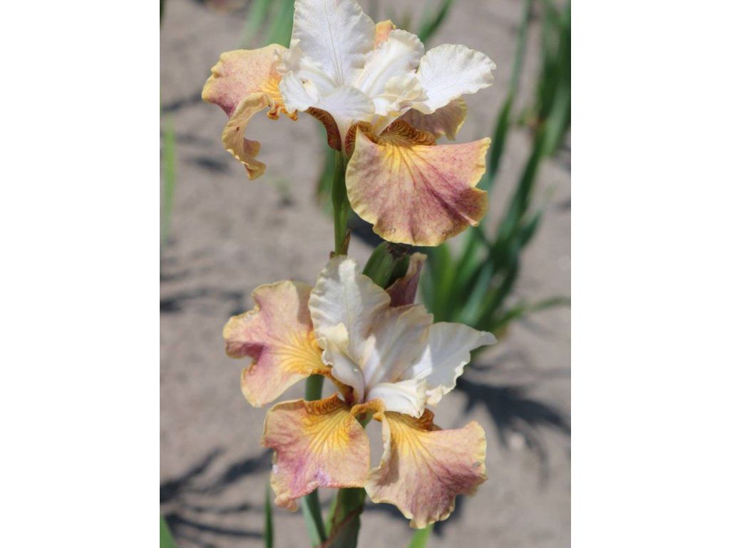 Sibirische Schwertlilie Peacock Butterfly® 'Jerry Murphy' - eine Sammlersorte unter den Schwertlilien, die in Bezug auf Anbau und Aussehen nur die besten Eigenschaften bietet. Ihr Hauptmerkmal sind große Blüten in warmen Farbtönen von Aprikose, Beige, Gelb und Weiß. Wie andere Arten bildet auch diese eine dichte, aufrecht wachsende Rosette aus schwertförmigen Blättern, die eine Höhe von 80 cm erreichen. Die Blüten erscheinen im Mai und Juni an sehr stabilen Stielen, die widrigem Wetter standhalten. Schwertlilien gehören aufgrund ihrer Anspruchslosigkeit und ihres ästhetischen Wertes zu den beliebten Pflanzen in Ziergärten und werden gerne in der Nähe von Wasserelementen und an den Rändern von Teichen gepflanzt. Sie werden für ihre Vielseitigkeit und Widerstandsfähigkeit in verschiedenen Landschaftsumgebungen sehr geschätzt.