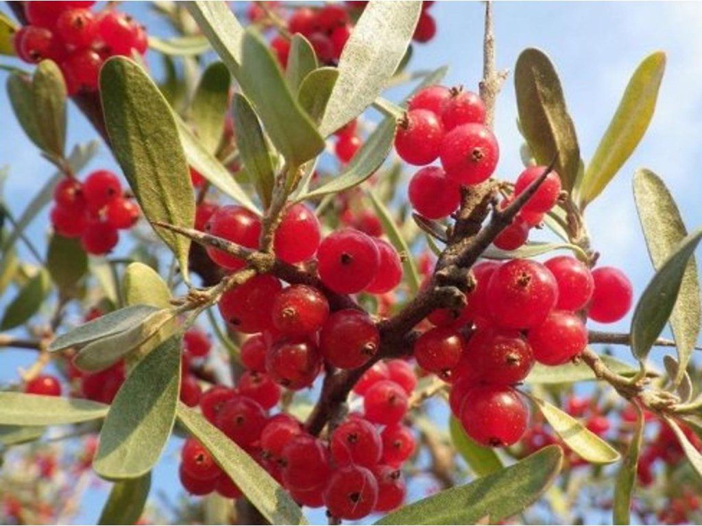 Silber-Büffelbeere - ein höherer Strauch, der eine Höhe von 2-6 m erreicht. Die Pflanzen sind zweihäusig, mit kleinen weißlich-gelben Blüten. Sie erscheinen erst im Alter von 2-3 Jahren. Der Strauch wird hauptsächlich wegen seiner kleinen scharlachrot-roten Beeren angebaut, für deren Bildung es notwendig ist, Pflanzen mit männlichen und weiblichen Blüten anzubauen. Die Früchte voller Vitamin C reifen an einjährigem Holz und werden durch Abschütteln geerntet, genau wie z. B. Sanddorn. Ähnlich wie bei Sanddorn kann eine männliche Pflanze bis zu 15 weibliche befruchten. Das Geschlecht der Pflanzen erkennt man erst an der Blüte (männliche sind gelb, weibliche eher unauffällig). Übermäßiger Verzehr der Früchte kann zu Magenbeschwerden führen.