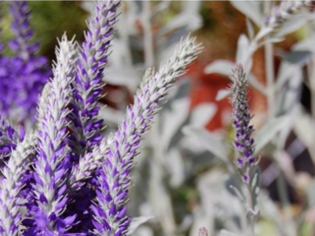 Veronica spicata 'Silberteppich' - eine Gartenform von Veronica spicata aus der Familie der Wegerichgewächse, die aus den Steppen- und Felsregionen Osteuropas und Westasiens stammt. Die botanische Art ist an trockene, offene Standorte mit voller Sonneneinstrahlung angepasst, was sich auch in den Eigenschaften dieser Sorte deutlich widerspiegelt. ‘Silberteppich’ bildet niedrige, dichte Bestände mit niederliegenden bis aufrecht wachsenden Trieben. Die Blätter sind schmal, lanzettlich, dicht filzig und haben eine ausgeprägt silbrig-graue Färbung, die das ganze Jahr über dekorativ bleibt. Im Juni und Juli erscheinen über den Blättern kurze, aufrechte, ährenförmige Blütenstände mit kleinen Blüten in blau-violetten Farbtönen. Die Blüten sind über dem hellen Laub gut sichtbar und wirken zart, aber kontrastreich. Die Sorte erreicht eine Höhe von etwa 15-25 cm und breitet sich allmählich in die Breite aus, wodurch zusammenhängende silbrige Teppiche entstehen. Dank seines reichen Nektarangebots ist er sehr bienenfreundlich und eignet sich für naturnahe Pflanzungen. Er findet Anwendung in Steingärten, trockenen Staudenbeeten, an Hängen sowie in Kombination mit Lavendel, Fetthenne oder Ziergräsern.