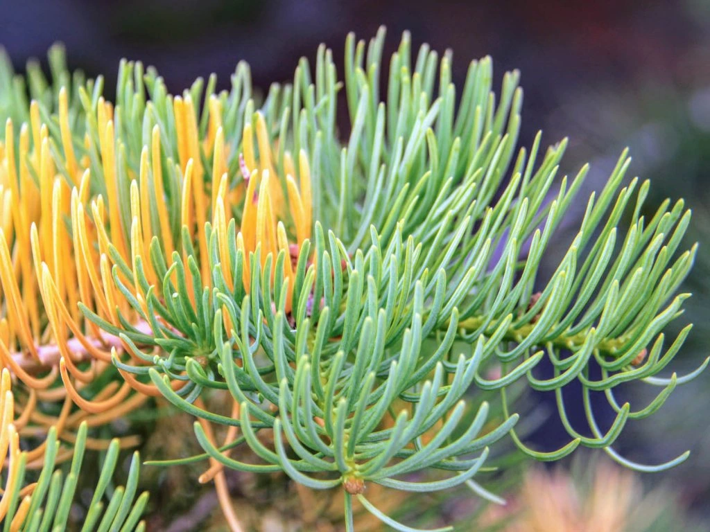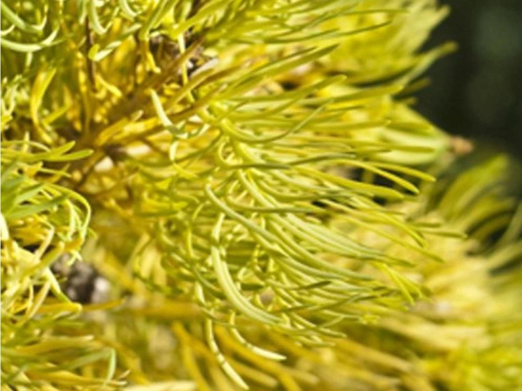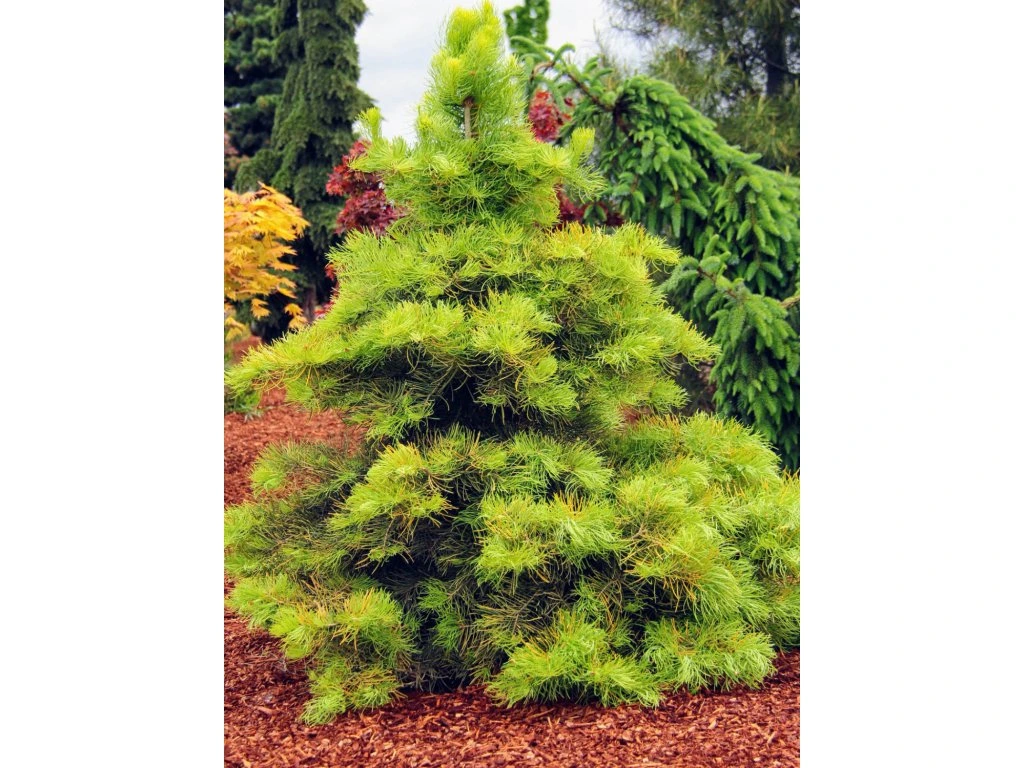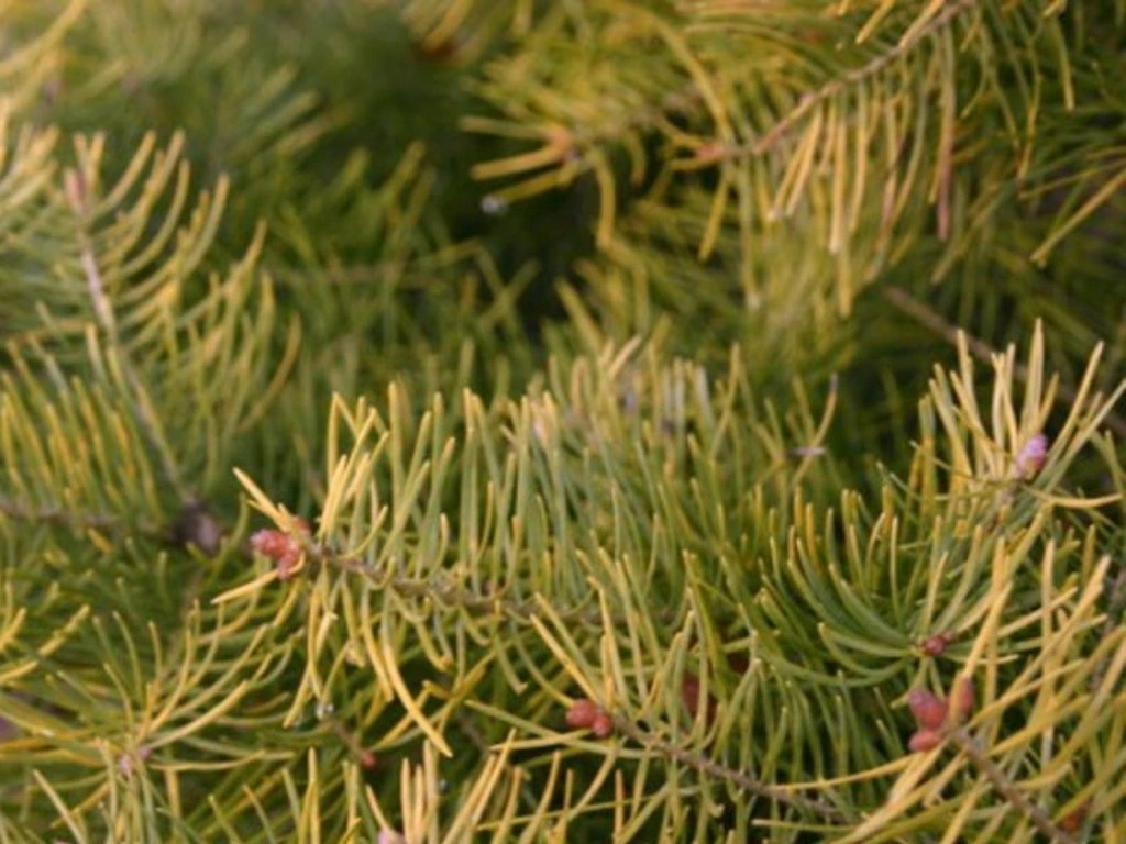Kolorado-Tanne 'Wintergold' - ein dekorativer, niedriger Kultivar mit natürlicher Kegelform und aufrechtem Wuchs, der eine Höhe von 1 bis 2 m und eine Breite von 0,8 bis 1,5 m erreicht. Die Nadeln sind lanzettlich, artentypisch und ihre Farbveränderung während der Saison sorgt für einen einzigartigen visuellen Effekt. Früh im Frühling treiben hellgrüne, junge Triebe aus, die einen Kontrast zu den buttergelben Nadeln des Vorjahres bilden. Nach und nach färben sie sich dunkelgrün und mit dem Einsetzen kühleren Wetters gehen sie in leuchtende gelb-goldene Farbtöne über. Die Verzweigung ist horizontal und regelmäßig, was eine einfache Formkorrektur durch Schnitt ermöglicht, ohne die dekorative Struktur zu beeinträchtigen. Dank ihrer kompakten Größe und ihres ausgeprägten Farbeffekts eignet sie sich für kleine Gärten, Steingärten, Kübel und als Solitärpflanze, wo sie in den Wintermonaten den Raum erhellen und dem Garten einen deutlichen Kontrast verleihen kann.