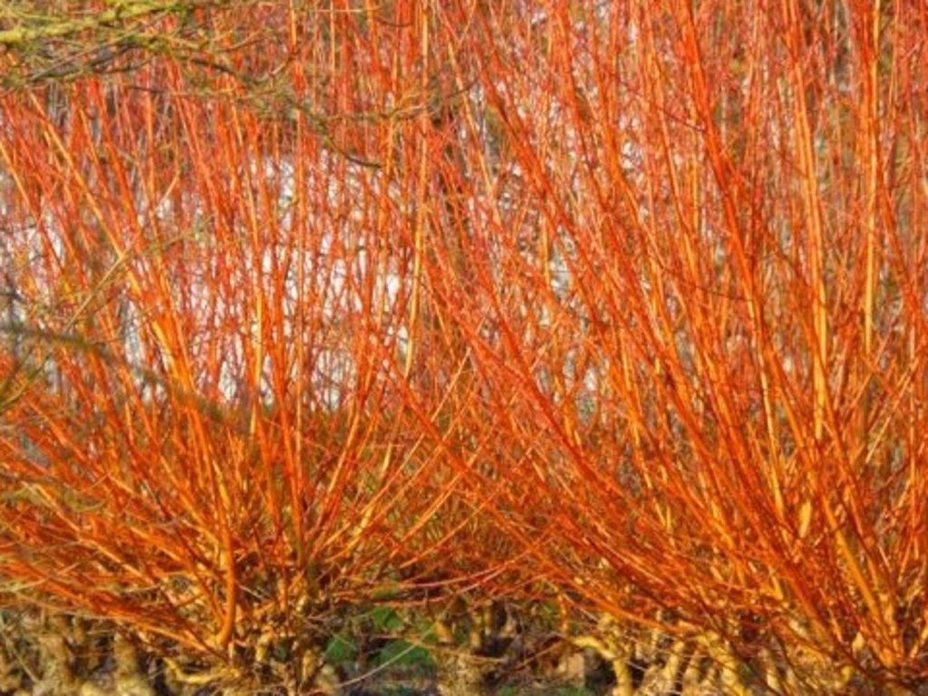 Salweide 'Yelverton' - eine Sorte, die für ihre farbenfrohen Stiele geschätzt wird. Wird oft als mehrstämmiger Strauch kultiviert. Im Laufe von zehn Jahren erreicht sie eine Höhe von 4,5 m und eine Breite von 3 m. Die Blätter sind schmal, lanzettlich und fein gezähnt. Sie sind grün gefärbt – vor dem Abfallen vergilben sie. Direkt nach dem Abfallen kommen die leuchtend rot-orangen Stiele zum Vorschein. Die Frühlingszuwächse sind dann eher gelb, bis gelb-orange.