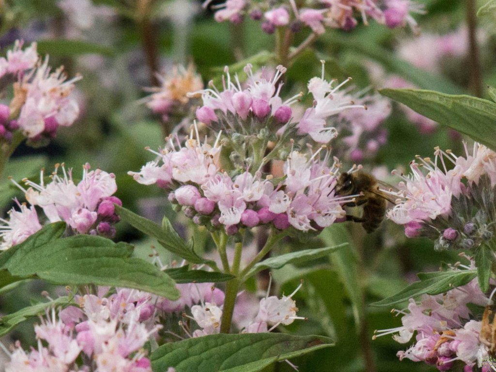 Bartgeißblatt 'Stephi' - eine kompakte Sorte, gezüchtet für einen zartrosa Blütenton und regelmäßiges, dichtes Wachstum. Die Art Caryopteris × clandonensis entstand als Kreuzung zwischen zwei asiatischen Arten, die natürlich in China und der Mongolei verbreitet sind. An den sonnigen, steinigen und trockeneren Hängen dort haben die Pflanzen eine Anpassung an wärmere, durchlässige Standorte entwickelt. Die Sorte 'Stephi' erreicht eine Höhe von 70-80 cm und eine Breite von etwa 80-100 cm, hat leicht verholzte Triebe und schmale, graugrüne Blätter mit einem silbrigen Schimmer. Das Laub ist aromatisch und setzt beim Berühren einen würzigen, leicht zitrusartigen Duft frei. Im August und September bilden sich an den Spitzen junger Triebe dichte, etwa 4-6 cm breite, halbkugelförmige Blütenstände aus vielen kleinen Blüten in einem hellrosa bis lavendelfarbenen Ton. Rosa gefärbte Staubgefäße verleihen den Blüten eine zarte Textur. Dank des Nektars lockt die Pflanze Bienen, Hummeln und kleine Schmetterlinge an. Sie findet Anwendung in naturnah gestalteten Beeten, im Vordergrund von gemischten Staudenpflanzungen, bei trockenheitsliebenden Stauden wie Sedum und Gaura sowie zwischen feineren Ziergräsern. Sie wirkt auch in modernen Gärten gut, wo der Kontrast des silbrigen Laubes und der zartrosa Blüten genutzt wird. In Kübeln auf Terrassen bildet sie einen dekorativen Strauch, der auch außerhalb der Blütezeit attraktiv bleibt.
