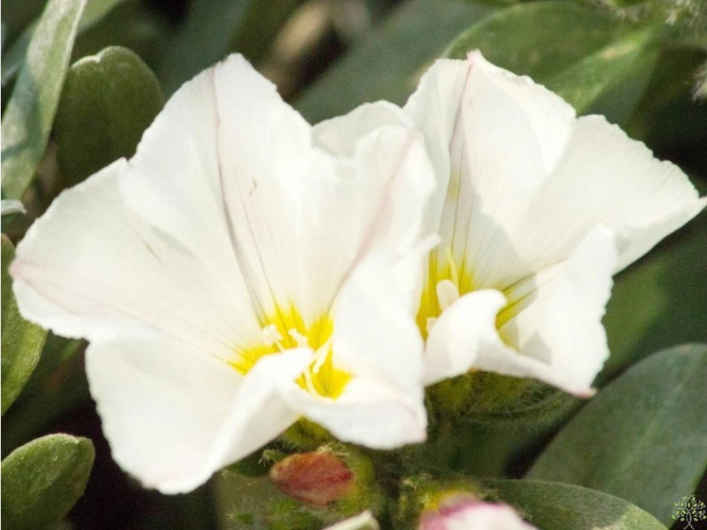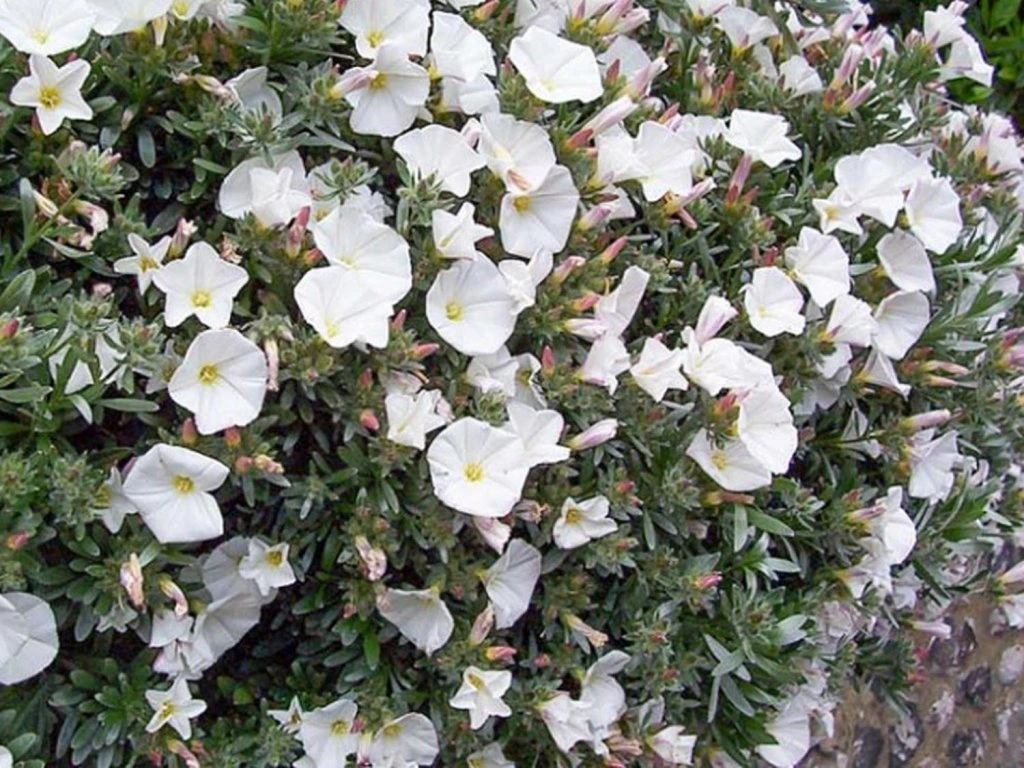 Silberblatt-Winde - ein äußerst eleganter, immergrüner Halbstrauch aus den sonnenverwöhnten Küstenregionen des Mittelmeers. Diese kompakte Pflanze erreicht eine Höhe und Breite von etwa 40 bis 60 Zentimetern und bildet einen ordentlichen, halbkugeligen Strauch. Die Pflanze zeichnet sich durch schmale, lanzettliche Blätter aus, die dicht mit feinen silbrigen Härchen bedeckt sind. Dadurch erhält der gesamte Strauch einen auffälligen, seidig-metallischen Glanz, der auch außerhalb der Blütezeit im Garten strahlt. Er ist nur begrenzt frosthart (bis ca. -10 °C), daher wird er meist als Kübelpflanze an sehr geschützten, trockenen Standorten mit gründlicher Winterabdeckung kultiviert. Der hauptsächliche ästhetische Vorteil liegt in der massiven Blüte, die einen Kontrast zum silbrigen Blattgrund bildet. Vom späten Frühling bis zum Sommer (Mai–Juli) erscheinen an den Triebspitzen rosafarbene Knospen, aus denen sich reinweiße, trichterförmige Blüten mit gelber Mitte öffnen. Die Blüten öffnen sich nur bei Sonnenschein und sind für Bestäuber sehr attraktiv. Im Gegensatz zu seinen Unkraut-Verwandten breitet sich diese Art nicht durch Rhizome aus und rankt sich nicht unkontrolliert, sondern behält ihre ordentliche, strauchartige Form. Geeignet als Solitärpflanze für Kübel auf sonnigen Terrassen oder Pergolen.