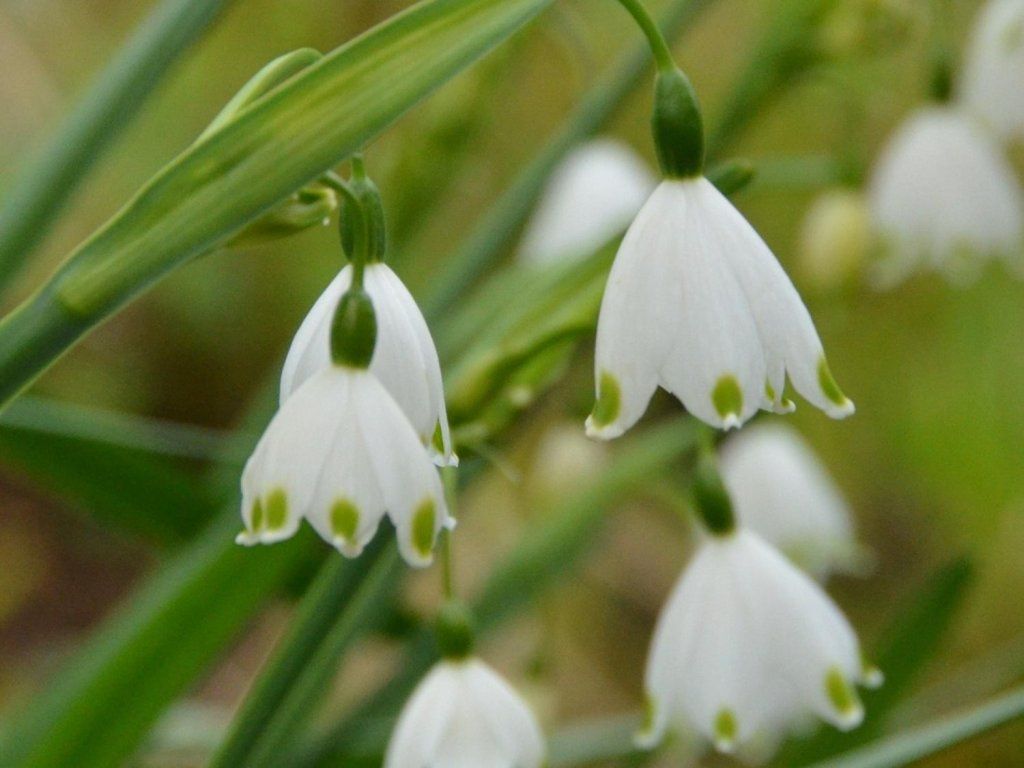 Sommer-Märzbecher - beliebte Märzenbecher bringen romantische Atmosphäre in jedes Beet oder jede Gruppenbepflanzung. Angenehm duftende Blüten erscheinen reichlich ab dem späten Frühling. An jedem aufrecht wachsenden Stiel erscheinen 4 - 8 schneeweiße glockenförmige Blüten. Die Blütenblätter sind auffallend mit einem erbsengrünen Punkt verziert, was einen schönen Kontrast bildet. Die Blätter wachsen in Büscheln und sind dunkelgrün. Sie eignet sich für jede Gruppenbepflanzung.