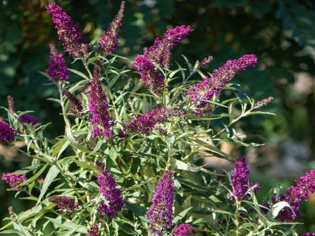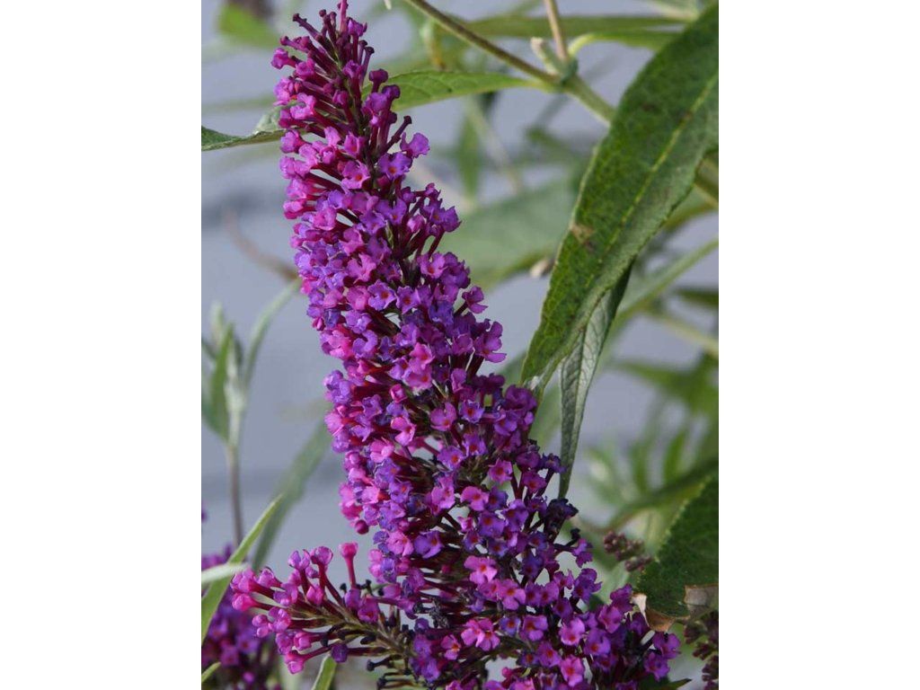 Buddleja davidii 'Butterfly Tower' - oder Schmetterlingsflieder, ist zweifellos eine wunderbare und praktische Ergänzung der Schmetterlingsflieder-Familie. Dieser Strauch wurde von der renommierten englischen Firma Thompson and Morgan gezüchtet und 2019 auf den Markt gebracht. Auf den ersten Blick mag er wie ein kleiner und kompakter Busch wirken, aber im Laufe der Saison beginnt er zu einem schmalen und dichten Säulenstrauch heranzuwachsen, mit Blüten, die vom Boden bis zum Himmel reichen oder besser gesagt bis zu einer Höhe von etwa 2 m, wobei er seine schlanke Form beibehält. Ab Juli erscheinen an der Pflanze 10-14 cm lange Blüten, die ausgeprägte aufrechte Rispen aus tief purpur-fuchsiafarbenen Blüten mit sehr angenehmem Duft bilden. Diese wunderschönen Blüten duften nicht nur, sondern locken auch Insekten an, insbesondere Schmetterlinge und Bienen. Er blüht bis zum Herbst, vorausgesetzt, es ist sonnig und warm und wenn Sie verblühte Rispen regelmäßig entfernen. Er sieht in Kombination mit blühenden Stauden in verschiedenen Farben umwerfend aus. Die laubabwerfenden Blätter sind frisch bis dunkelgrün auf der Oberseite und silbrig auf der Unterseite (ebenso wie die jungen Stängel). Sie sind gegenständig, schmal lanzettlich, fein behaart und füllen die gesamte Pflanze perfekt aus. Dieser Strauch wächst schnell und behält seine Dichte und seinen kompakten Habitus bei.