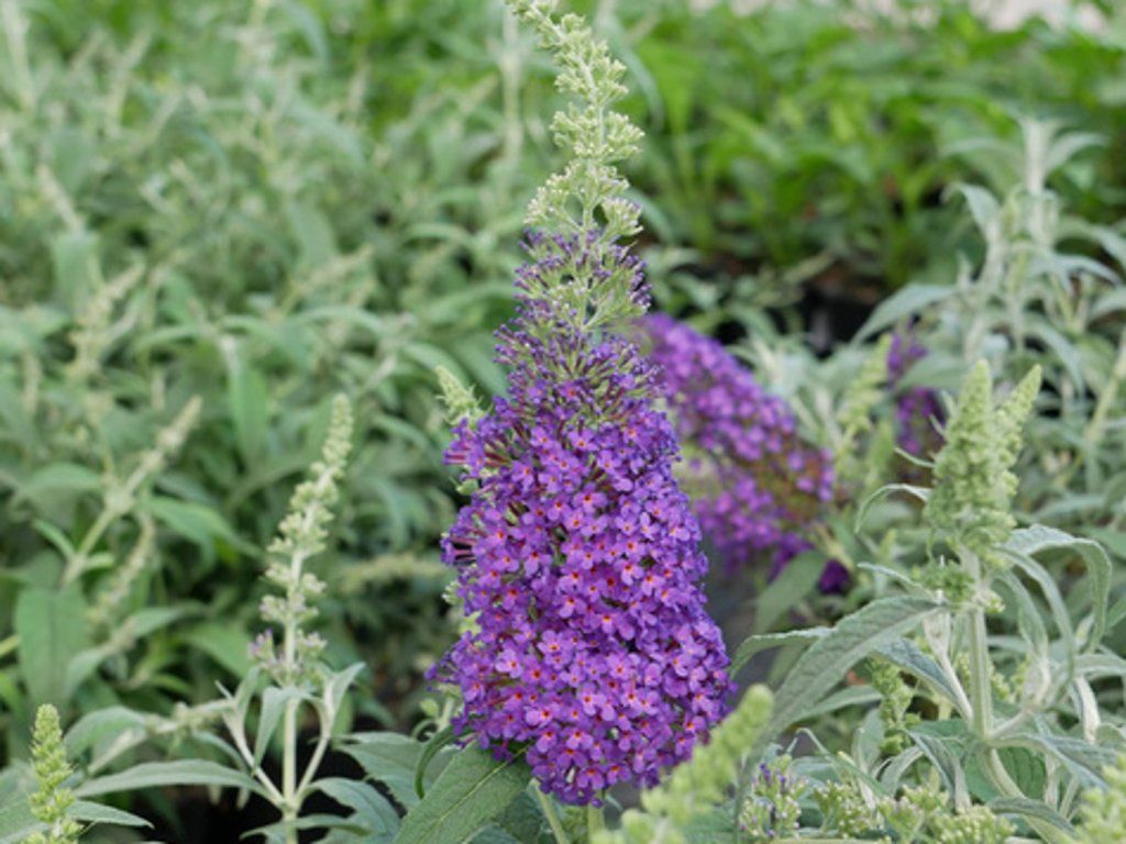 Sommerflieder 'Summer Bird Blue' - eine Zwergform des Sommerflieders, die sich aufgrund ihrer Größe für jeden Garten eignet. Im ausgewachsenen Zustand erreicht sie eine Höhe von nur 40–50 cm. Die Blüten öffnen sich an der Spitze fester Stängel von Juli bis Oktober. Sie sind blau-violett gefärbt und wachsen in traubenförmigen Rispen. Ideal für die Pflanzung in größeren Steingärten, Beeten oder in einem Topf als Solitärpflanze. Er ist pflegeleicht und bringt ein interessantes Aussehen in jeden Garten. Die Blüten sind eine große Anziehungskraft für bestäubende Insekten.
