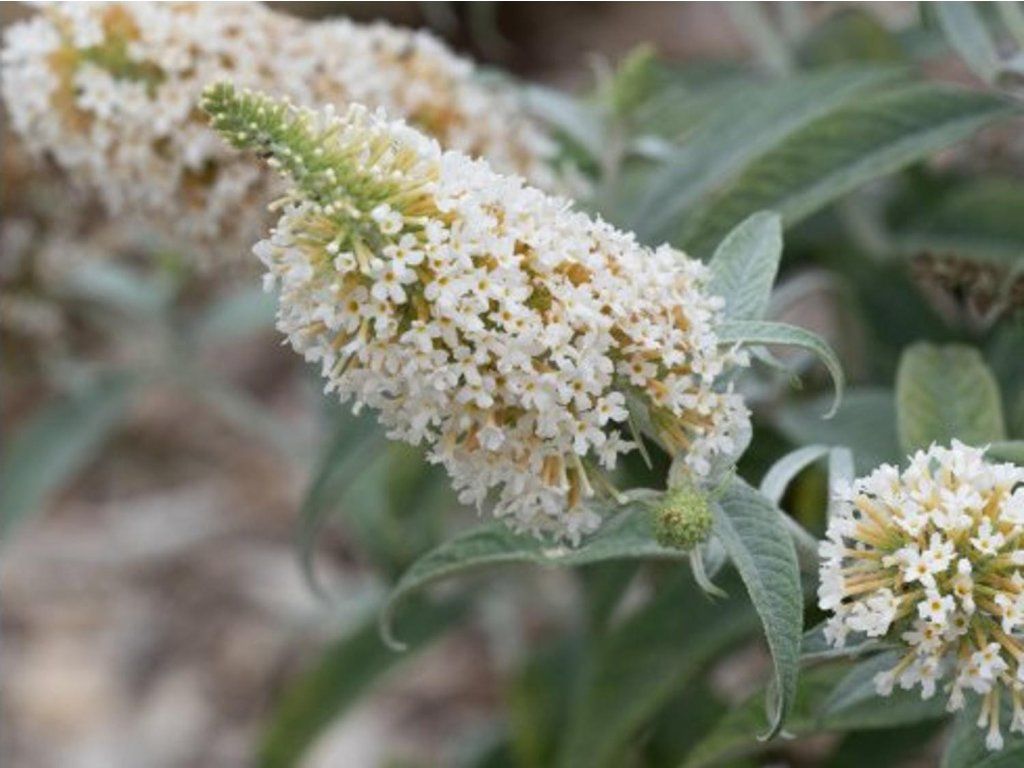 Buddleja davidii 'White Ball' - eine attraktive Buddleja-Sorte, die sich durch elegante Blüten und kompaktes Wachstum auszeichnet. Sie erreicht eine Höhe von bis zu 2,5 m (je nach Sorte). Die Blüten sind klein, weiß, dicht und bilden einen zusammenhängenden kugelförmigen Blütenstand. Sie verströmen einen zarten, süßen Duft, der Bienen und Schmetterlinge anlockt. Sie erscheinen von Juli bis Oktober. Die Blätter sind schmal, grau-grün, bieten einen guten Kontrast zu den weißen Blüten und erzeugen ein fein strukturiertes Aussehen. Sie ist eine ausgezeichnete Wahl, wenn Sie eine schöne und pflegeleichte Pflanze suchen, die Ihrem Garten oder Ihrer Terrasse wochenlang Blüten und eine angenehme Atmosphäre verleiht.