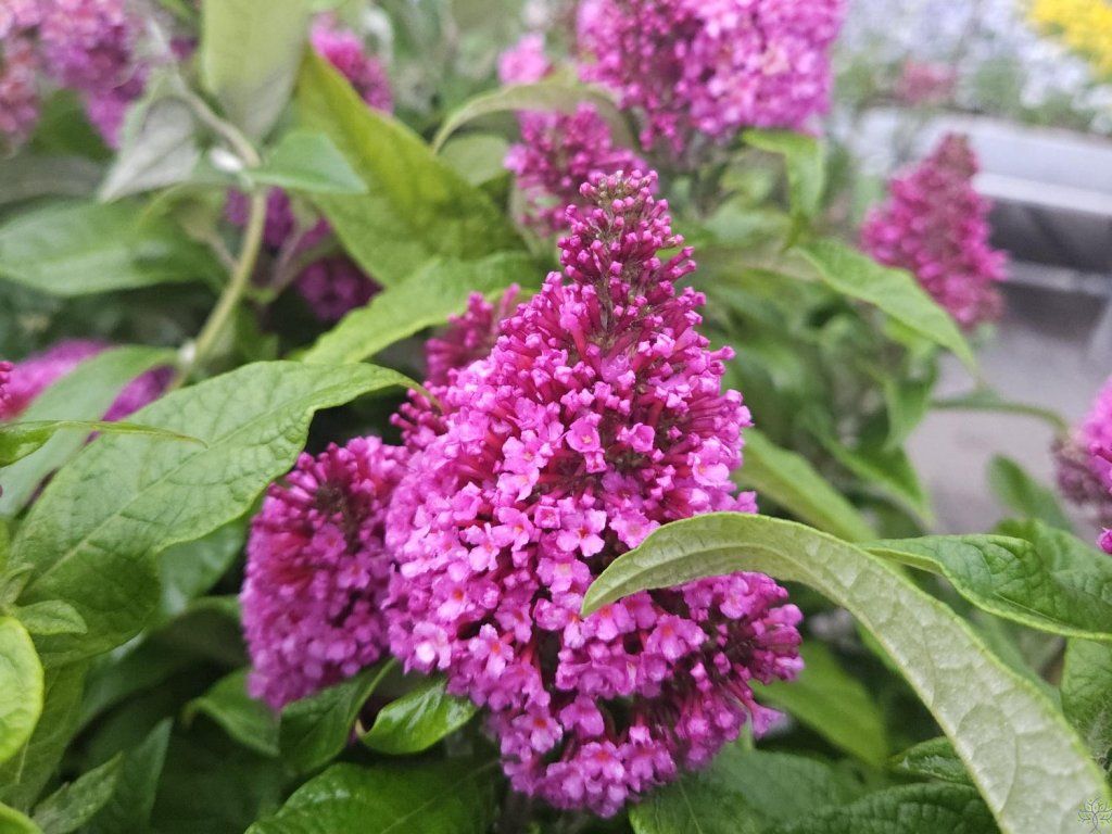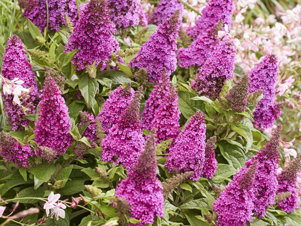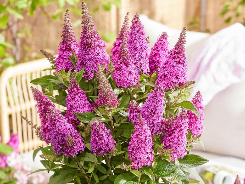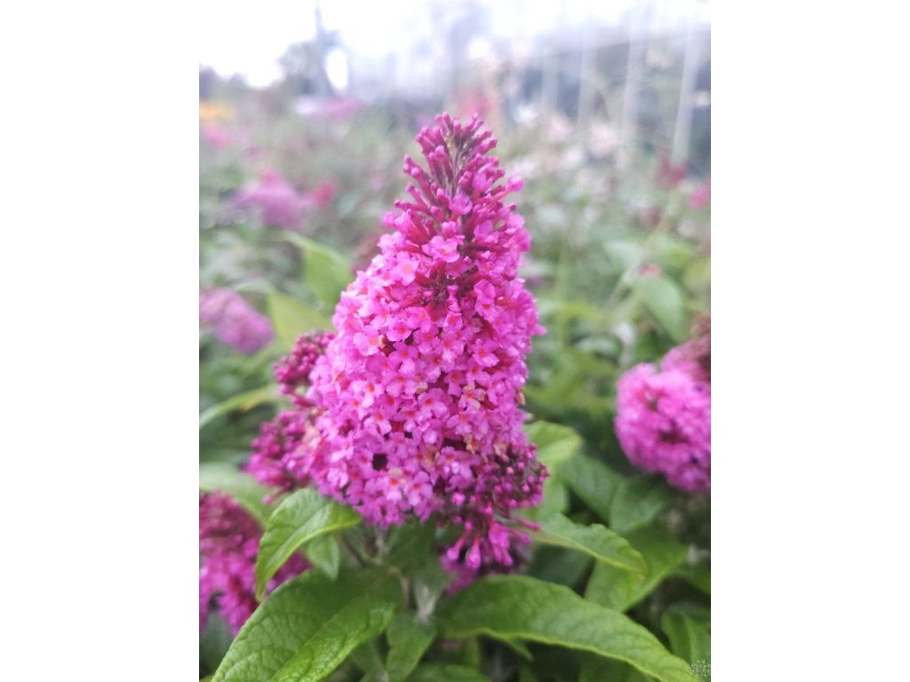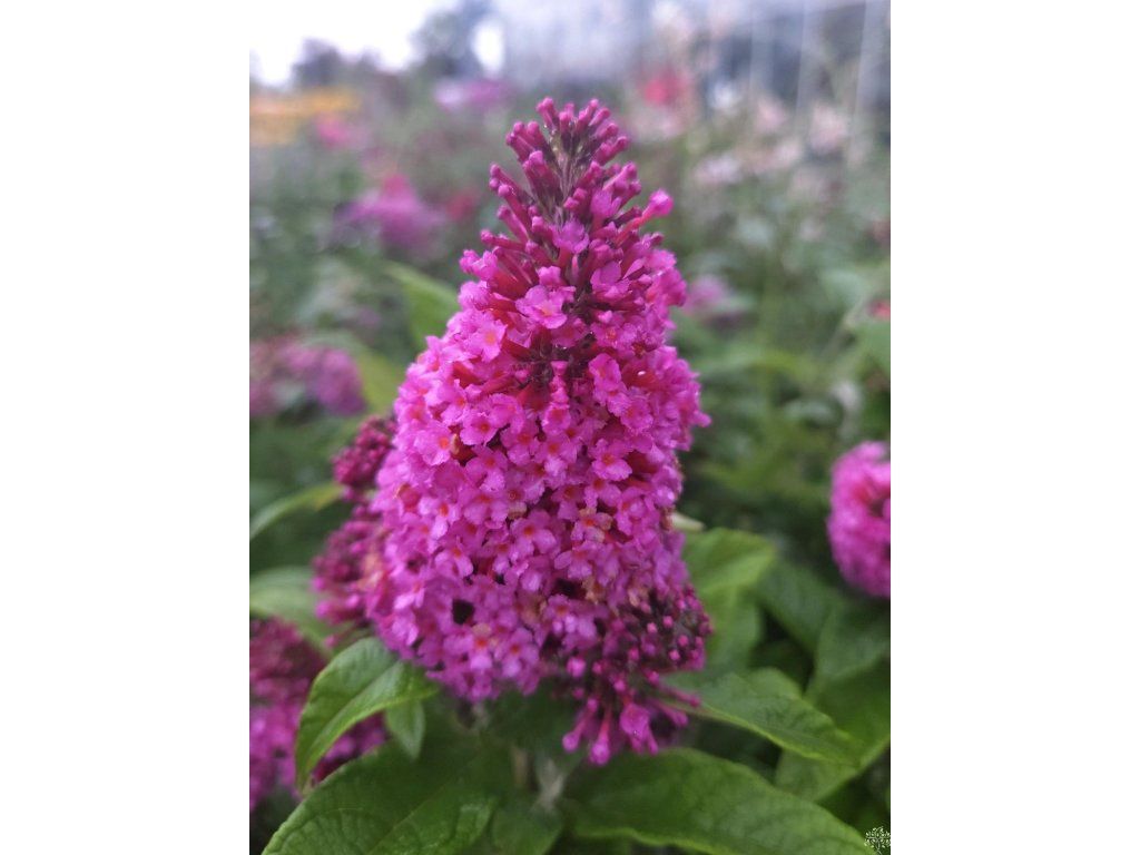 Schmetterlingsflieder Butterfly Candy 'Little Cerise' - dieser Kultivar ist Teil der niederländischen Serie Butterfly Candy, die sich auf niedrige, fest kompakte Sorten mit dichter Verzweigung und beständiger Blütenfarbe konzentriert. Die Art stammt aus Kiesablagerungen und trockenen Hängen Zentral- und Westchinas, daher benötigt sie Wärme, volles Licht und schnell entwässerten Boden. 'Little Cerise' bildet einen niedrigen, bogenförmig gewölbten, dicht verzweigten, laubabwerfenden Strauch, der etwa 0,6–0,8 m hoch und breit ist. Die Blätter sind gegenständig, lanzettlich, oberseits mittel- bis leicht graugrün, unterseits fein filzig. Ab Mitte Sommer erscheinen an den Spitzen der diesjährigen Triebe zahlreiche, kegelförmige Blütenstände von etwa 6–8 cm Länge. Die röhrenförmigen Blüten haben kirschrote bis purpurrosa Farbtöne mit einem warmen Auge im Schlund, duften zart süßlich und bieten reichen Nektar für Schmetterlinge, Bienen und Hummeln. Dank seines geringen Wuchses wächst er nicht übermäßig und eignet sich für den Vordergrund von gemischten Beeten, für kleinere Stadtgärten und auch für größere Behälter auf Terrassen und Balkonen. In der Komposition wirkt er ausgewogen mit niedrigeren Gräsern, zum Beispiel mit Schwingelgräsern oder mit Sommerstauden kühlerer Farben, wie Katzenminze, Salbei, Gamander oder argentinischer Eisenkraut.