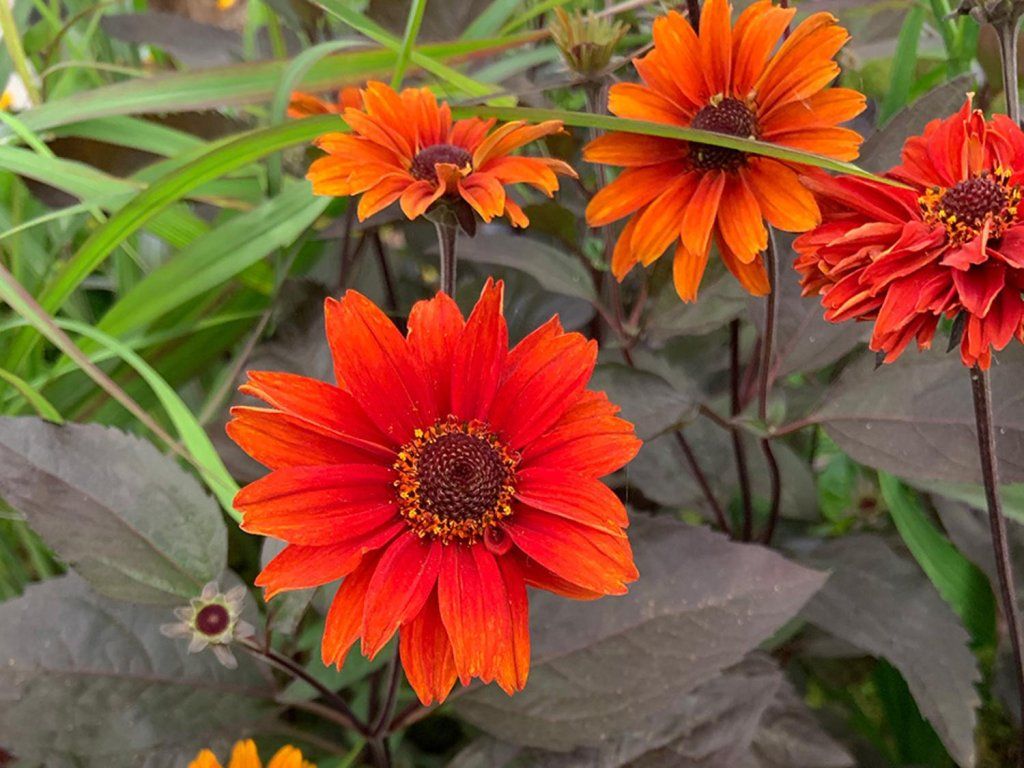 Garten-Chinaschilf 'Fire Twister' - eine Zierstaude, die eine Höhe von etwa 100-120 cm erreicht. Ihre Blätter ähneln Brennnesselblättern, sind gezähnt, dunkelgrün bis rötlich, länglich-dreieckig und glänzend. Im Laufe der Sommermonate, also von Juli bis September, erscheinen leuchtend rot-orange Blüten, die auf aufrechten Stielen getragen werden. Die Blütenblätter sind um einen rotbraunen Mittelteller angeordnet. Die Pflanze eignet sich für Staudenbeete, kommt in Kombination mit Gräsern gut zur Geltung, ideal zum Schnitt. Sie verschönert Ihr Beet und Ihr Zuhause.