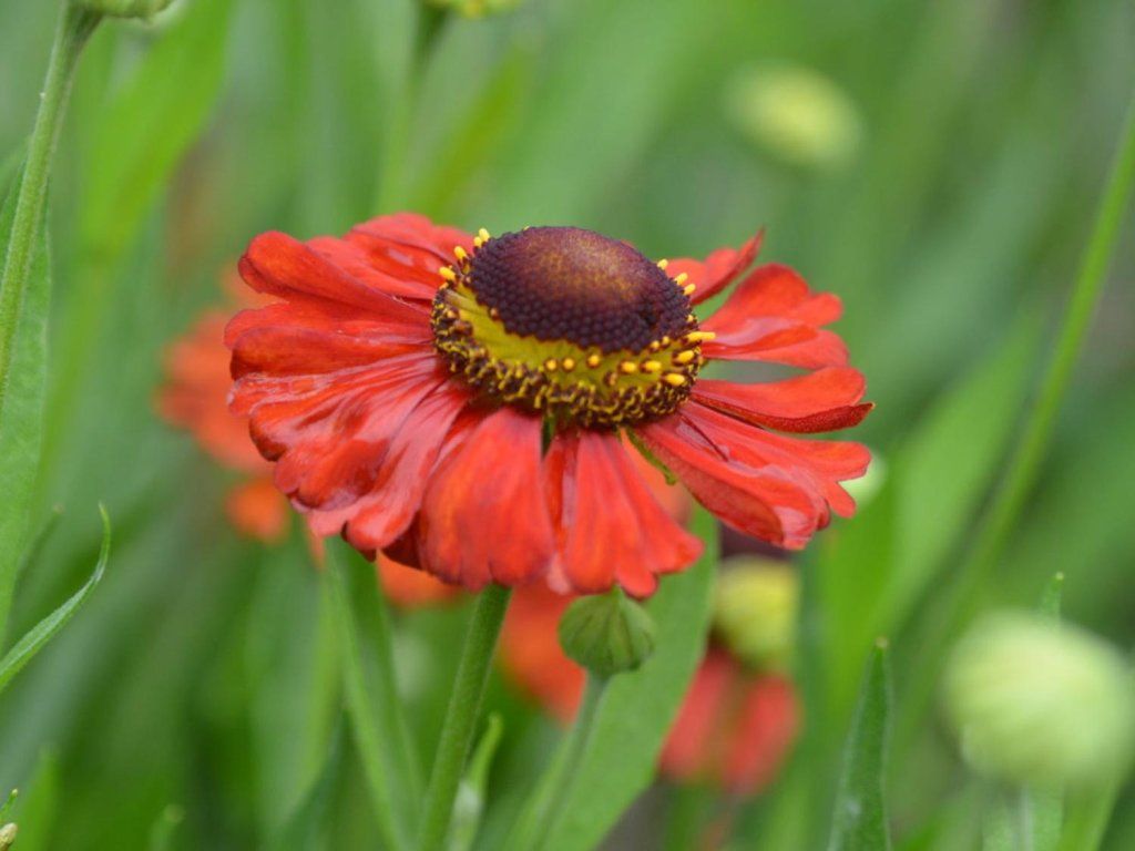 Sonnenbraut 'Red Army' - eine anspruchslose Staude, die von Juli bis Oktober mit dunkelroten margeritenartigen Blüten blüht. Diese verfärben sich nach dem Verblühen orange. Sie werden gerne von Hummeln und Bienen besucht. Er erreicht eine Höhe von 60-80 cm auf kräftigen grünen Stielen.